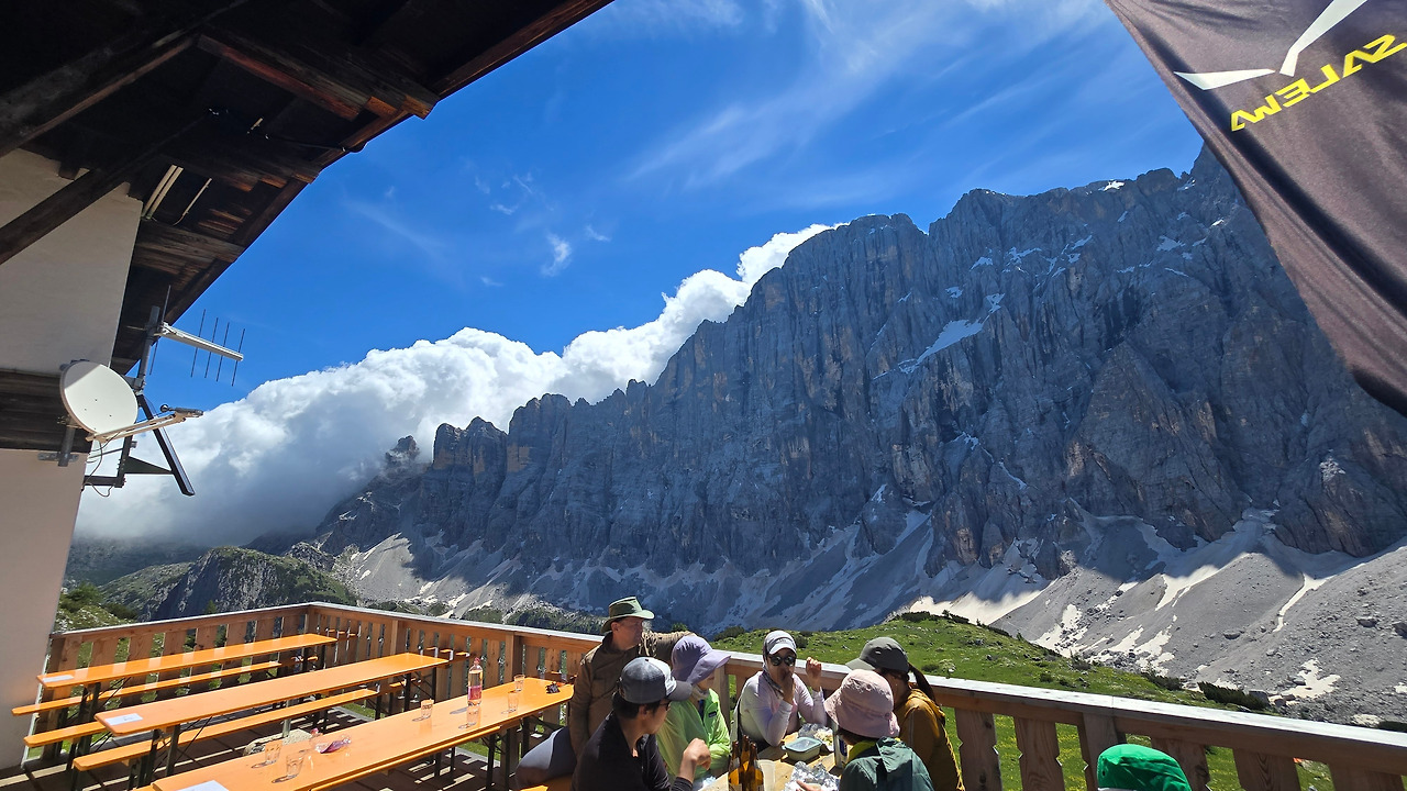 어제 잠을 잔 꼴다이(Coldai) 산장은 치베타 산 바로 밑에 있다. 이 말인즉, 꼴다이 산장까지 엄청 걸어 올라야 한다. 일행 중 생일을 맞이한 가장 나이 많은 선배 생일(78세)이라서 생일 케이크를 배달해야 했다. 자발적으로 한 일이지만 산에 오르면서, 한 손으로 균형을 잡는 일이 힘들어, 끊임없이 욕이 수시로 튀어나왔다. 인성이 부족한 거야 어쩔 수 없지만. 결과적으로 멋진 생일 축하가 되어 고생한 보람을 훨씬 넘어섰다. 동양에서 온 낯선 이를 축하하고 함께 박수를 친 그날 그 밤 산장 분위기를 어디서 재현해 볼까? 시간은 산장에도 어김없이 다녀갔다.