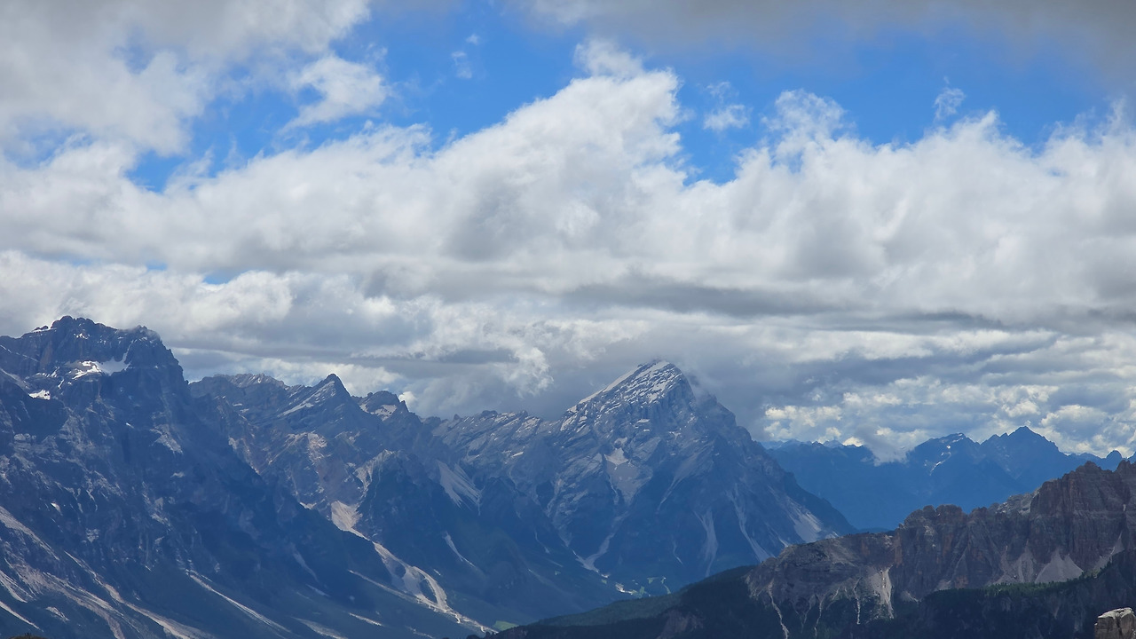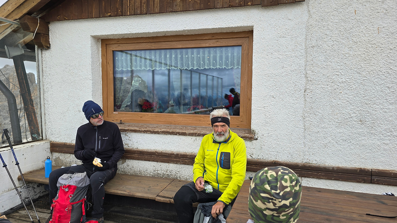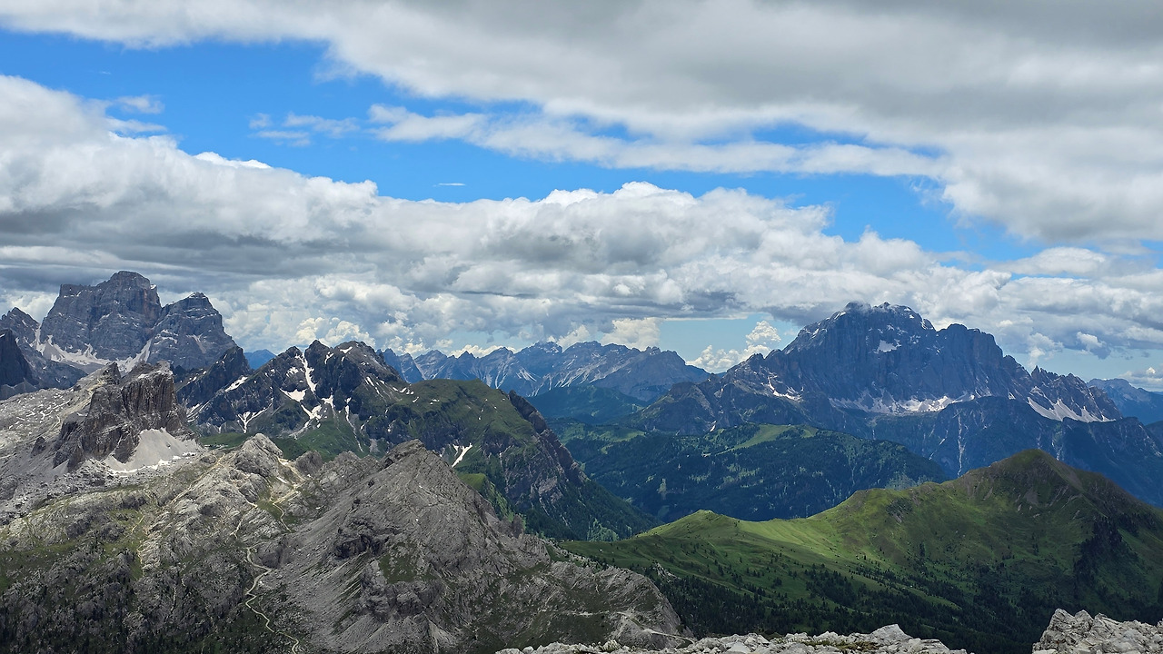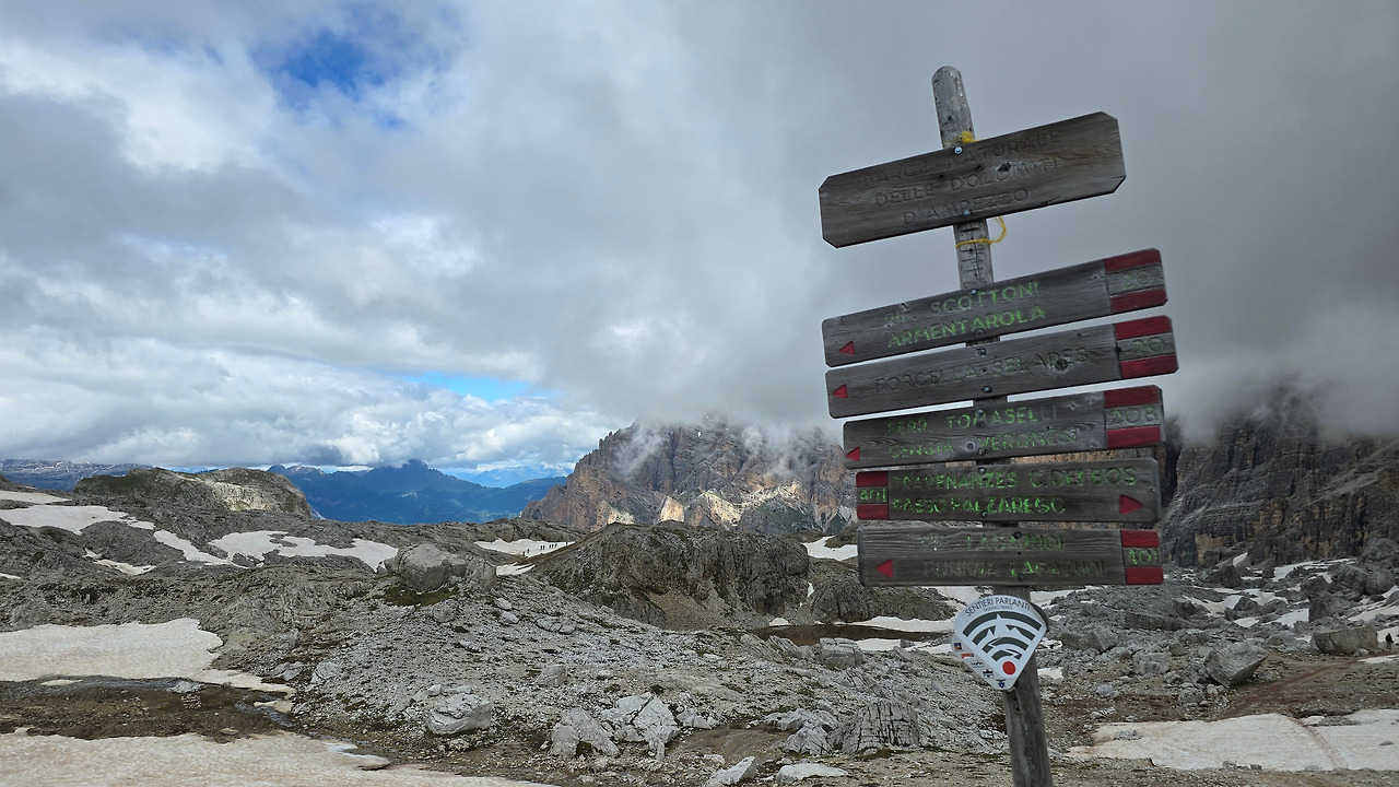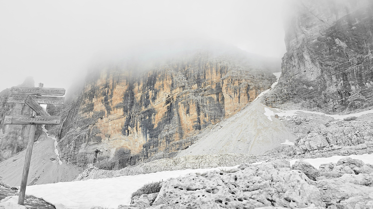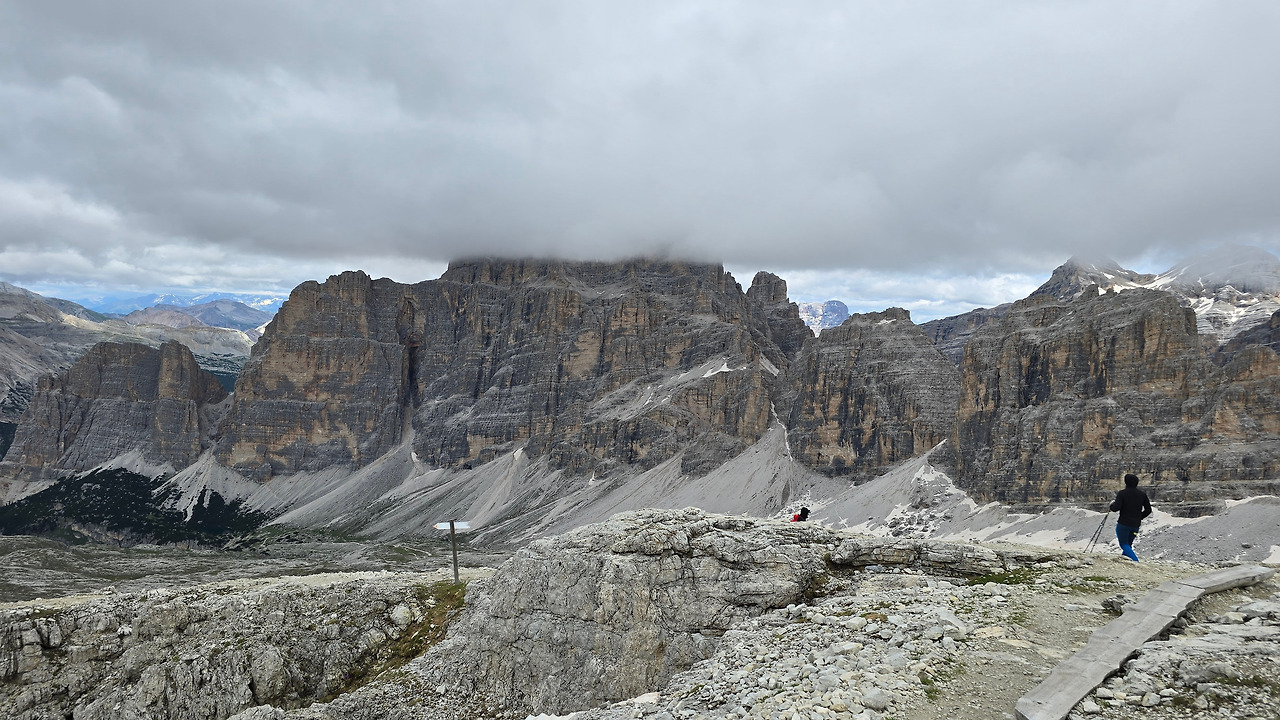오늘은 여기서 라가주오이(Lagazuoi)산장을 경유해서 친퀘 토리 산장까지 가는 여정이다. 프랑스 샤모니에서도 느낀 거지만 고산지대에서 맞이하는 비가 다 거추장스럽고 불편하기만 한 것은 아니다. 이로 인해 예기치 않게 경치가 배가 되기도 한다. 몸은 고달파도. 비구름이 사방을 꽉 가려 시야를 막지만 않는다면 산등성이라든가 자연이 연출하는 모습이 더 아름답다. 비가 그친 다음에 자연이 선물을 주는 것 같다. 그러니 어제 내린 비로 인해 오늘 시야가 기대된다. 비가 그친 돌로미티 지역이라니. 사방이 빵 트이겠지?