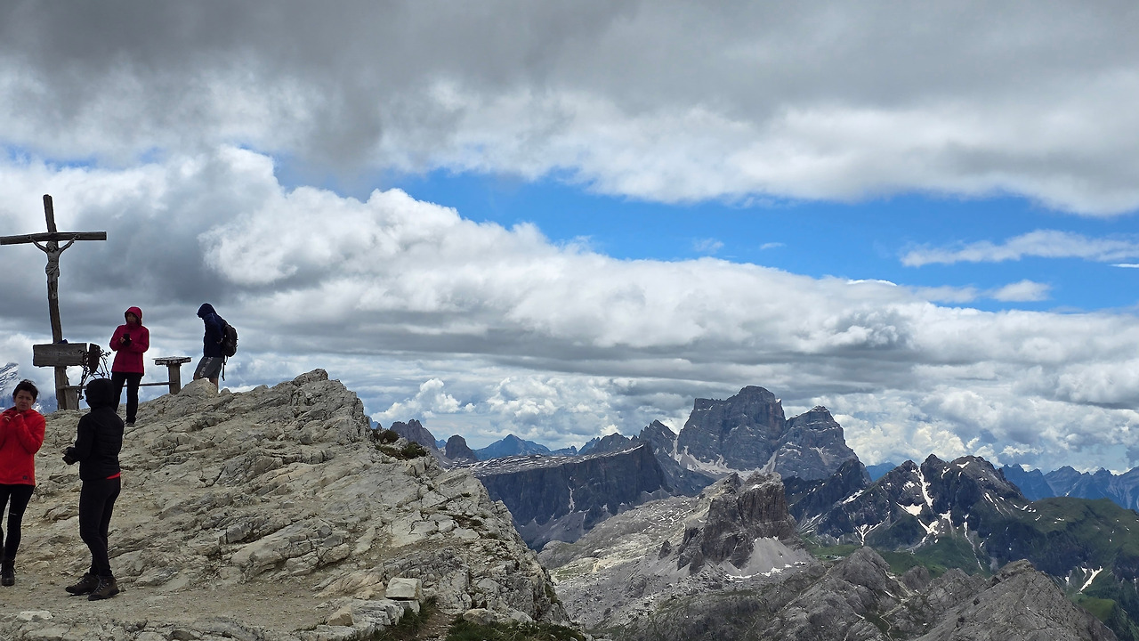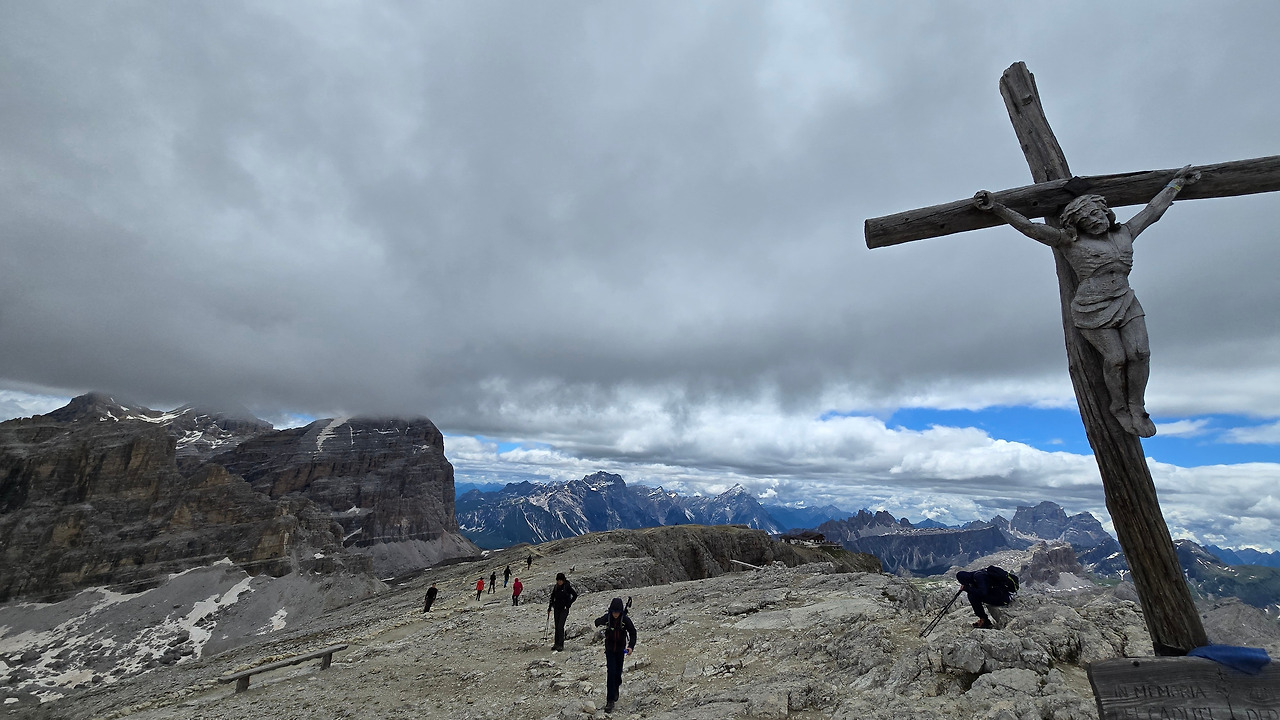 두 번째는 이곳을 리프트 혹은 곤돌라(Funi via Lagazuoi)를 타고 바로 올라올 수 있어서 그런지 어린아이들부터 할아버지까지 이탈리아 사람들이 많았다. 학교 선생님을 따라 기도하는 어여쁜 초등학생(?)들부터 원숙한 등산가들까지. 여기에 나 같은 외지인들까지. 다종다양한 사람들. 이런 맛이다. 세 번째는 산장에서 몇 분만 걸어가면 죽은 자를 기리는 십자가 상이 나오는데, 구글에서 찾아보니 Monte Lagazuoi Piccolo라고 되어있다. 한글로는 야외 박물관. 박물관? 촌것이라 박물관 하면 반드시 건물 안을 말해야 하는데 아니었다. 정작, 어떻게 구분하는지 몰라도 라가주오이 피콜로는 정말 뷰에 관한 한 최고다. 최고!