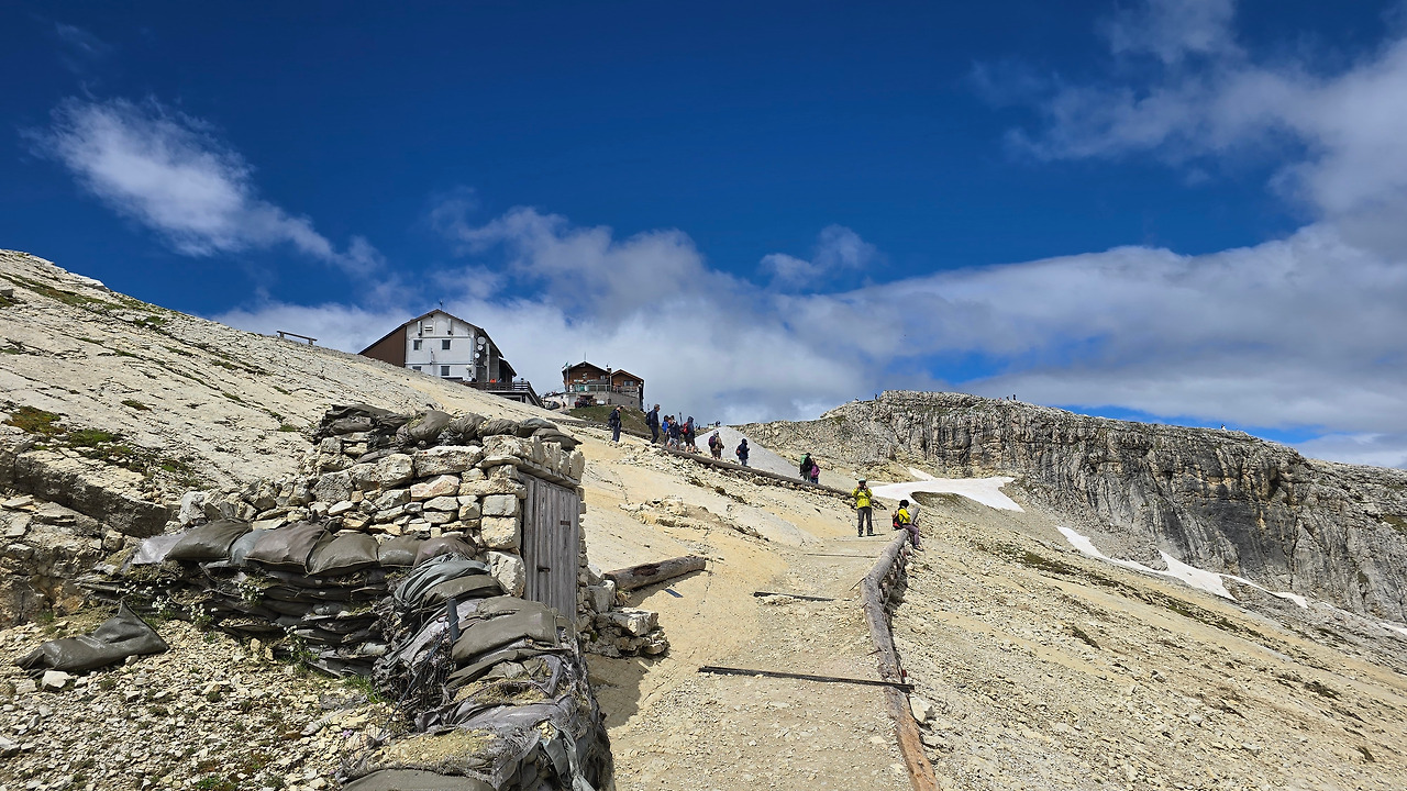 그런데 리프트 타는 곳 주변과 하산하는 지역 전체를 푼다 베리노 갤러리(Punda Berrino Galleries, Piccolo lagazuoi)라고 부르는데, 처음엔 이해가 가지 않다가 나중에는 고개가 끄덕여졌다. 라가주오이 산 주변이 1차 세계대전 때 격전지라는 역사적인 사실과 더불어 주변 풍경이 좋아 박물관이라고 하건 갤러리라고 하건 이해가 되었다. 주변 경치를 한 컷 한 컷 찍어 말 그대로 갤러리에 전시하나 자연에 그대로 두나 무슨 차이가 있을까마는. 아무리 생각해도 여기가 몇 수 더 위다. 사진은 순간을 잡지만, 여기는 영원을 잡아두는 곳이다. 그 변화무쌍함을 어찌 사진이 따를까?