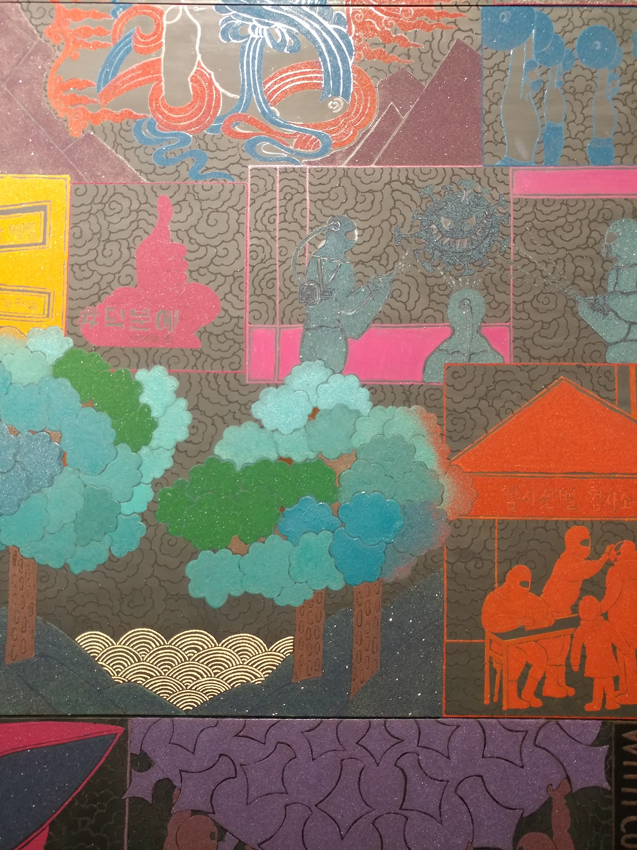 그러나, 만들어진 작품만큼은 찬미받을 만했다. 처음에는 이 말, 채색화라는 말을 잘 이해하지 못했다. 음, 한국화 분야에서 채색화가 배제되어 왔기에 기존에 등한시되던 민화와 채색화를 다시 재해석 해야 한다는 의미로 생의 찬미가 독해되었다. 한번 쓱 하고 보고 나서 채색화가 먼지 이해했다면 평상시 나와 같다. 뭔 말인고 하니, 잘 몰라도 잘 아는 것처럼 끄덕여오던 기존 습관이 그대로 드러났다는 말인데. 그래도 아주 조금 알 것도 같았다. 이런 것을 채색화라고 하는 구다. 채색화라고 전시된 대부분의 작품들이 좋았던 것은 '폼' 잡지 않아서였다. 뭔가 현대미술 하면 난해하기도 해서 난감할 때가 있었는데, 민화나 채색화가 우리 일상과 아주 가까웠던 것만큼은 확실히 이해되었다.