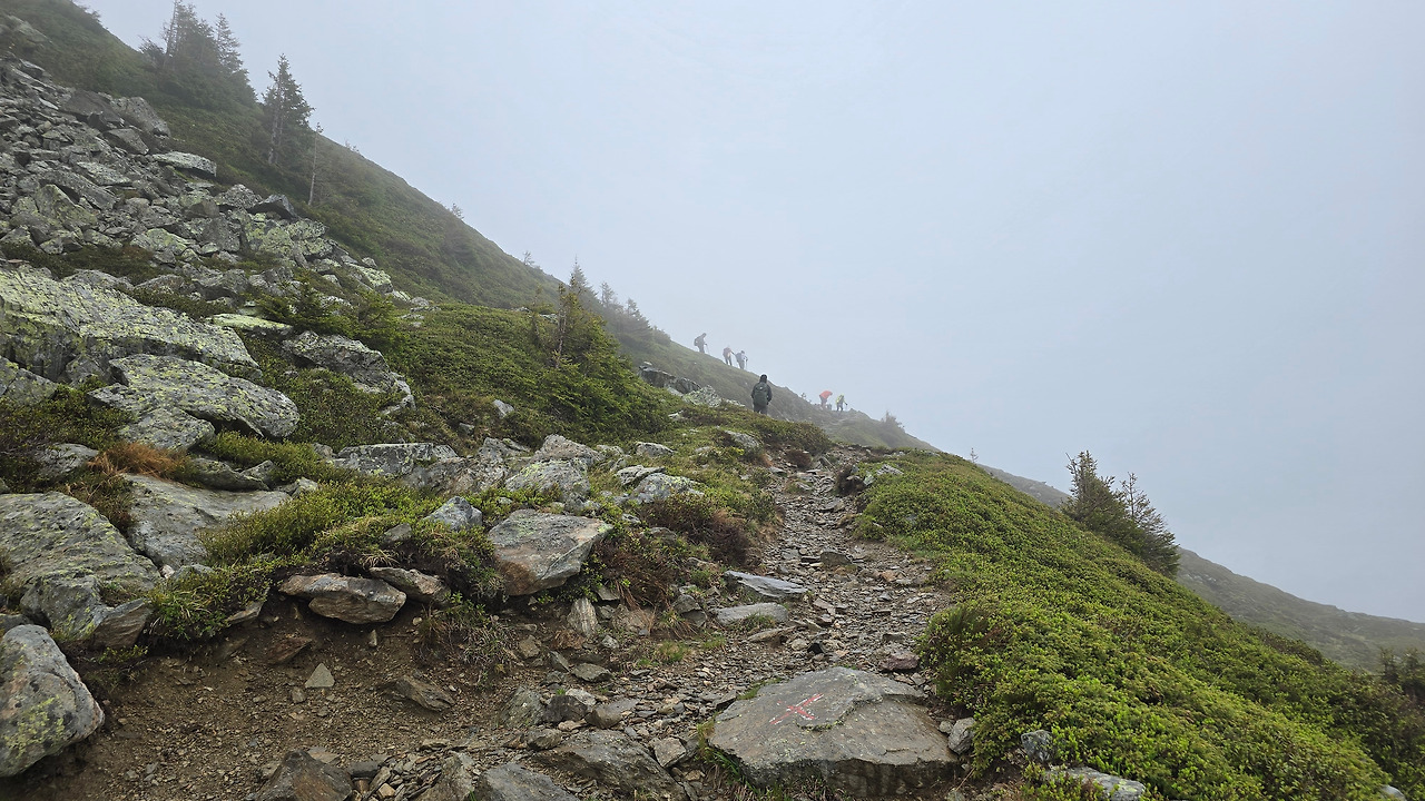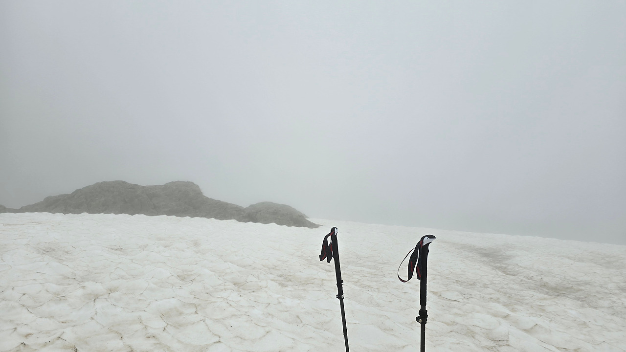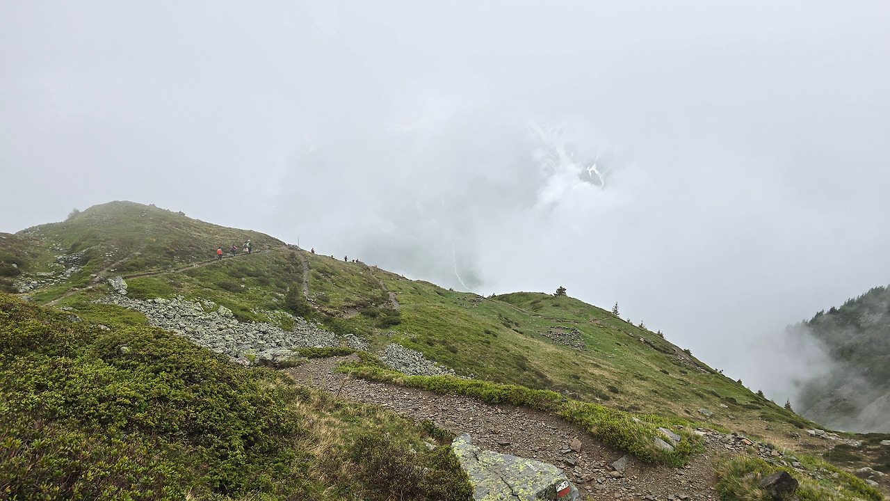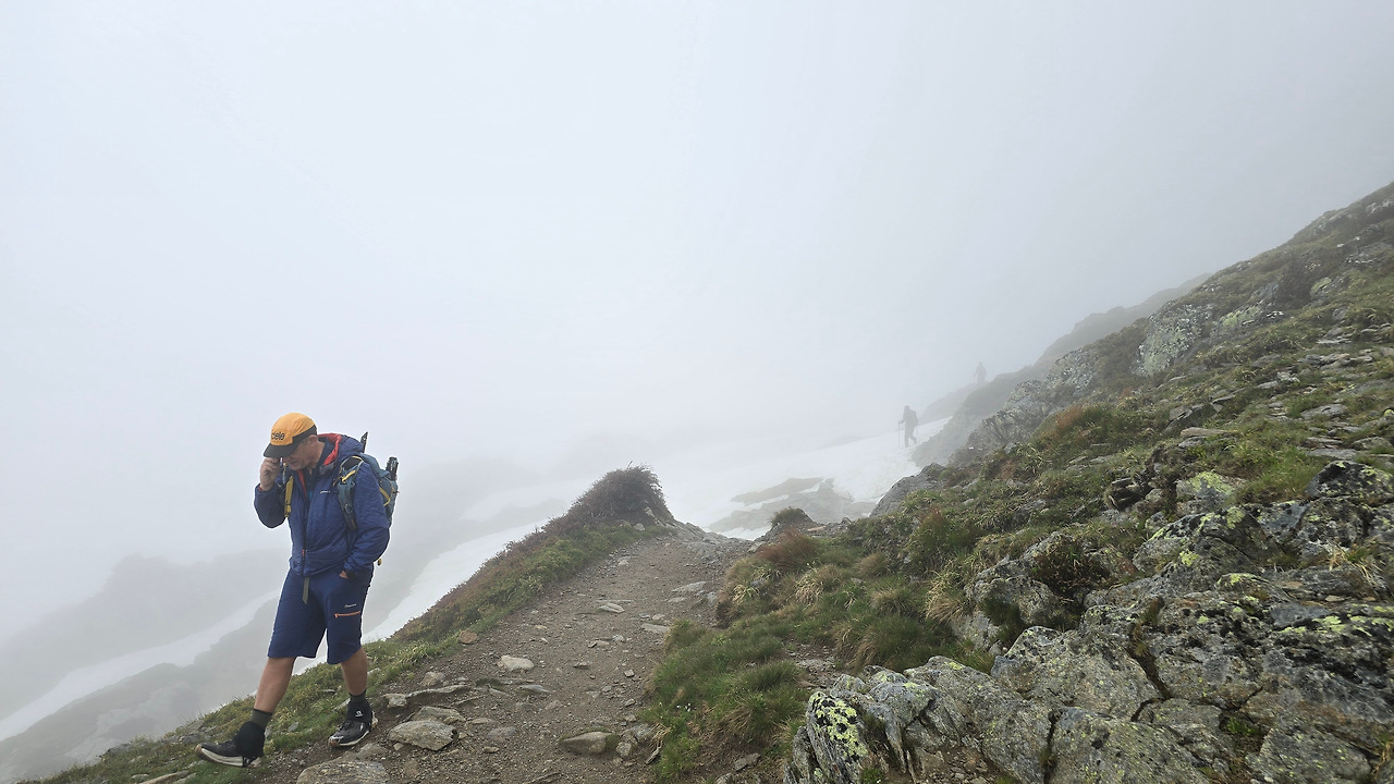 정상에서 내려다보지 못하는 마음이야 어쩌겠는가? 기도발이 약해 비가 멈추지 않았으니, 그래서 케이블카 타고 정상에 내려 어물쩍거리지 않고 바로 하산을 했던 것이다. 일차 목표는 벨라샤 산장 방향. 앞이 아무것도 보이지 않아 이리저리 헤매다가, 앞서간 프랑스 등산객 도움으로 겨우 방향을 찾아서 갔다. 온통 안개와 운무와 구름과 비와, 또 뭐더라. 아, 그래 그냥 미스티. 미스티다. 앞서 브레방 정상도 미스티. 뭐 본 게 있어야지. 암튼, 그렇게 방향을 겨우 잡고 내려가는데 트레일 바닥은 눈에 비가 내려 미끄러웠다.