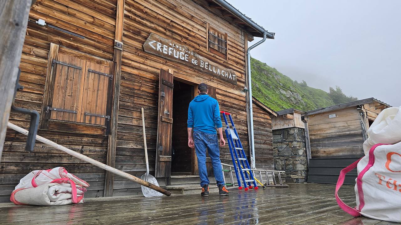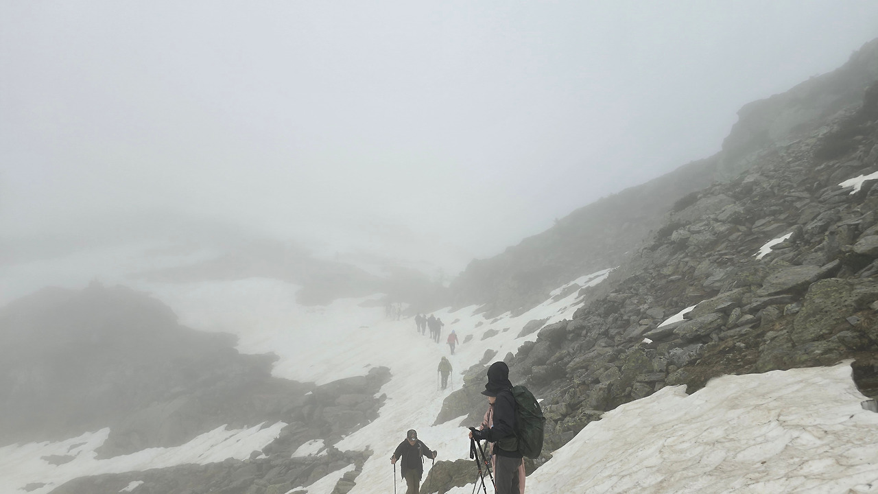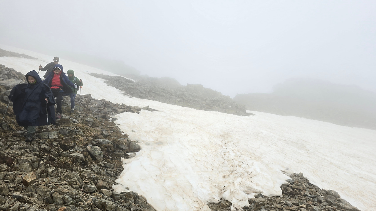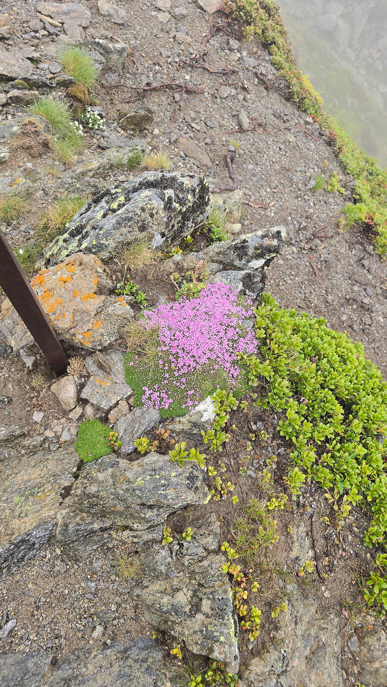 정상에서 내려다보지 못하는 마음이야 어쩌겠는가? 기도발이 약해 비가 멈추지 않았으니, 그래서 케이블카 타고 정상에 내려 어물쩍거리지 않고 바로 하산을 했던 것이다. 일차 목표는 벨라샤 산장 방향. 앞이 아무것도 보이지 않아 이리저리 헤매다가, 앞서간 프랑스 등산객 도움으로 겨우 방향을 찾아서 갔다. 온통 안개와 운무와 구름과 비와, 또 뭐더라. 아, 그래 그냥 미스티. 미스티다. 앞서 브레방 정상도 미스티. 뭐 본 게 있어야지. 암튼, 그렇게 방향을 겨우 잡고 내려가는데 트레일 바닥은 눈에 비가 내려 미끄러웠다.