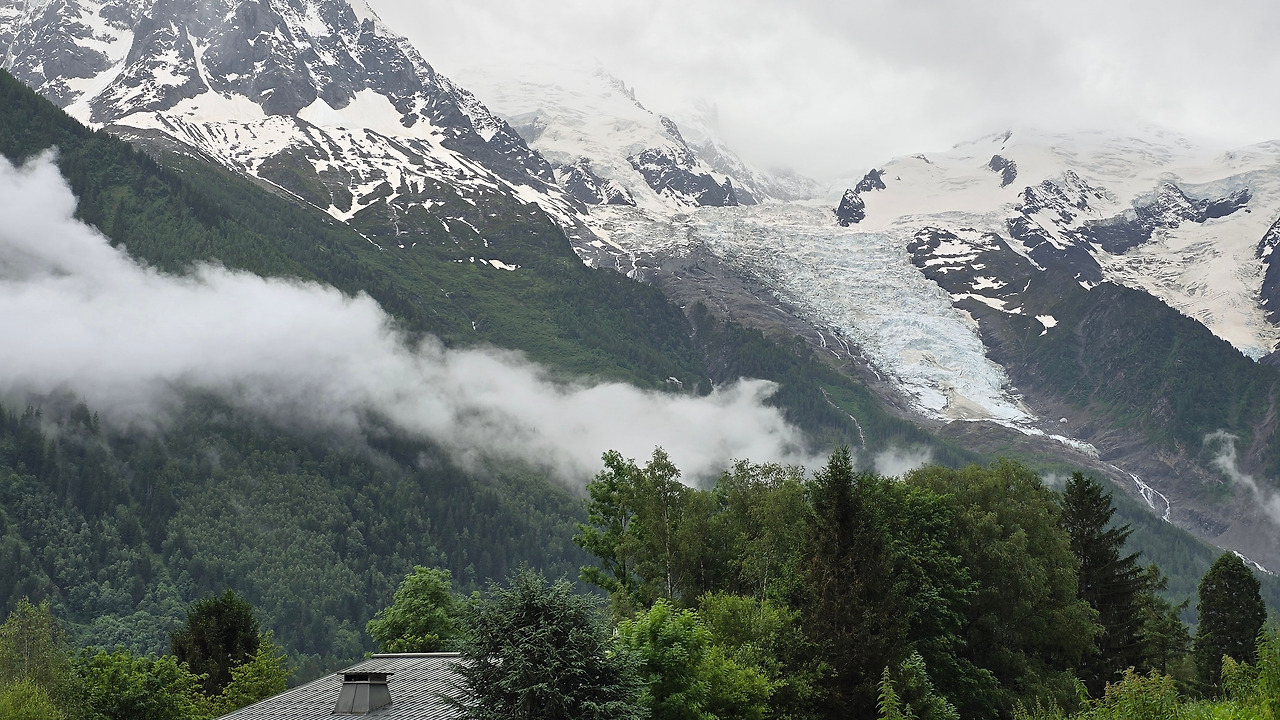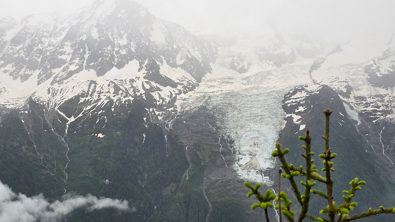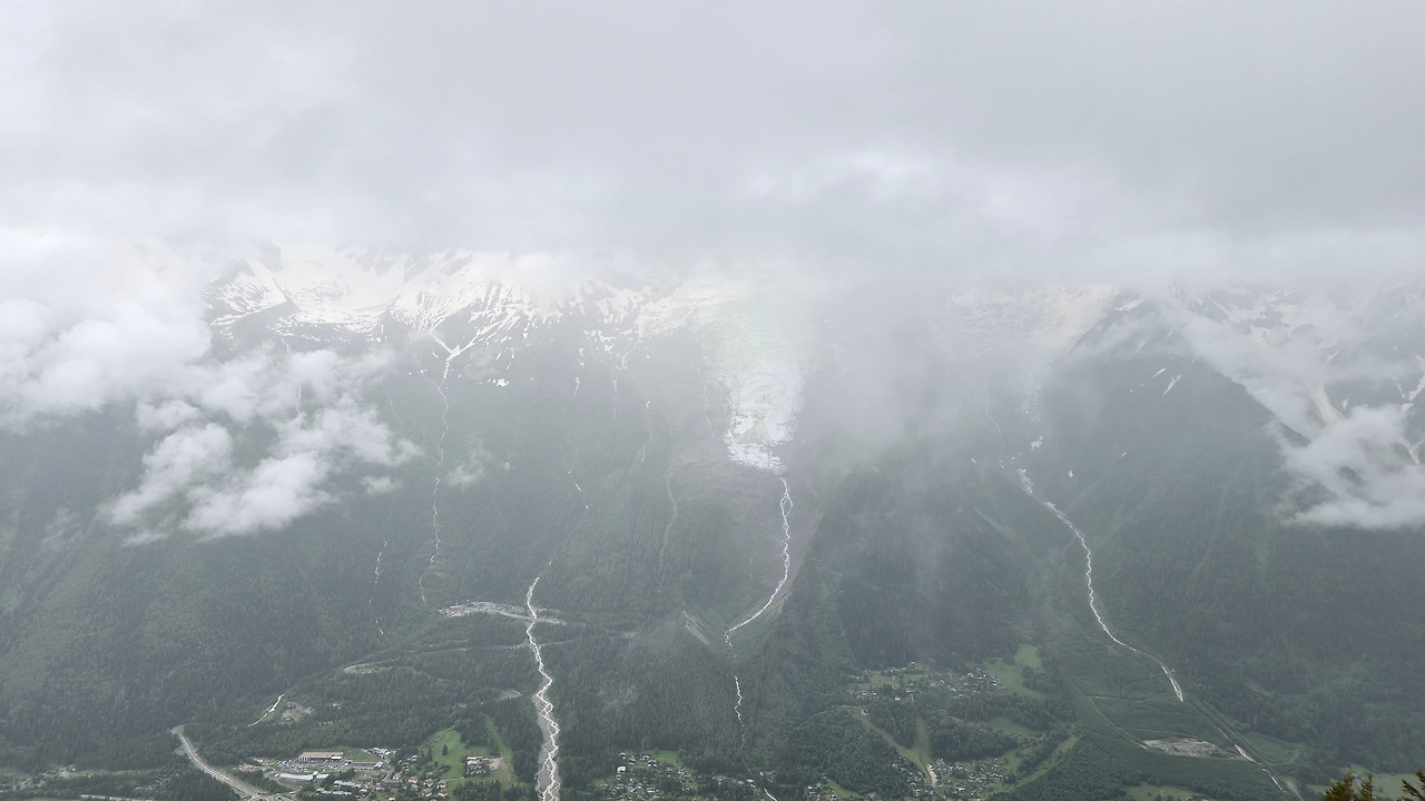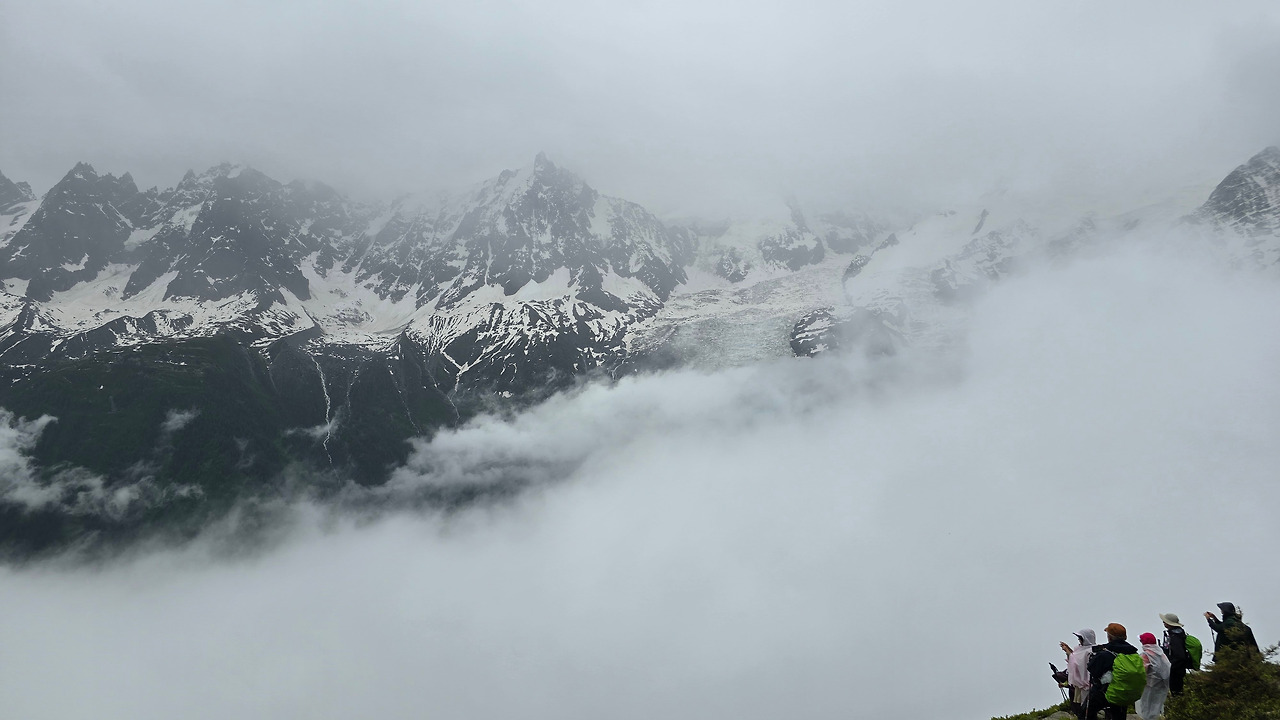 우리가 걷던 산등성이 반대편 산등성이 쪽 에귀이 듀 미디 방향이 온통 물난리다. 산에서 물이 합쳐서 밑으로 내리는데 장관이다. 사람 장관 말고 경치 장관. 썰렁하군! 그중에서 단연 뽀송뽀송 자태를 뽐내는 보쏭 빙하. 아마 비가 오니 눈이 밀려 빙하가 더 아래로 처진 것 같은 모양. 그런데 이것이 좋다. 빙하야 눈 쌓인 것이 오래되면 빙하라 부르지 않던가. 눈앞 가까이에 이렇게 빙하가 나 좀 보라고 하다니!