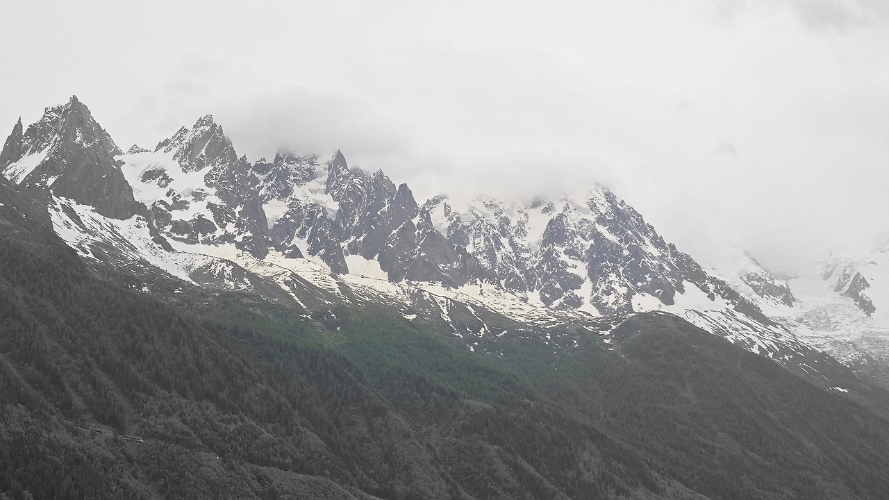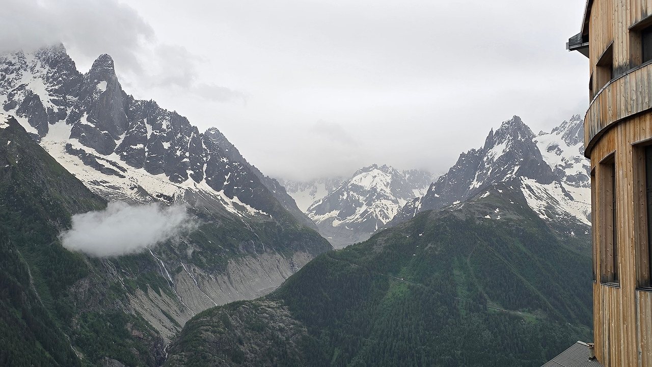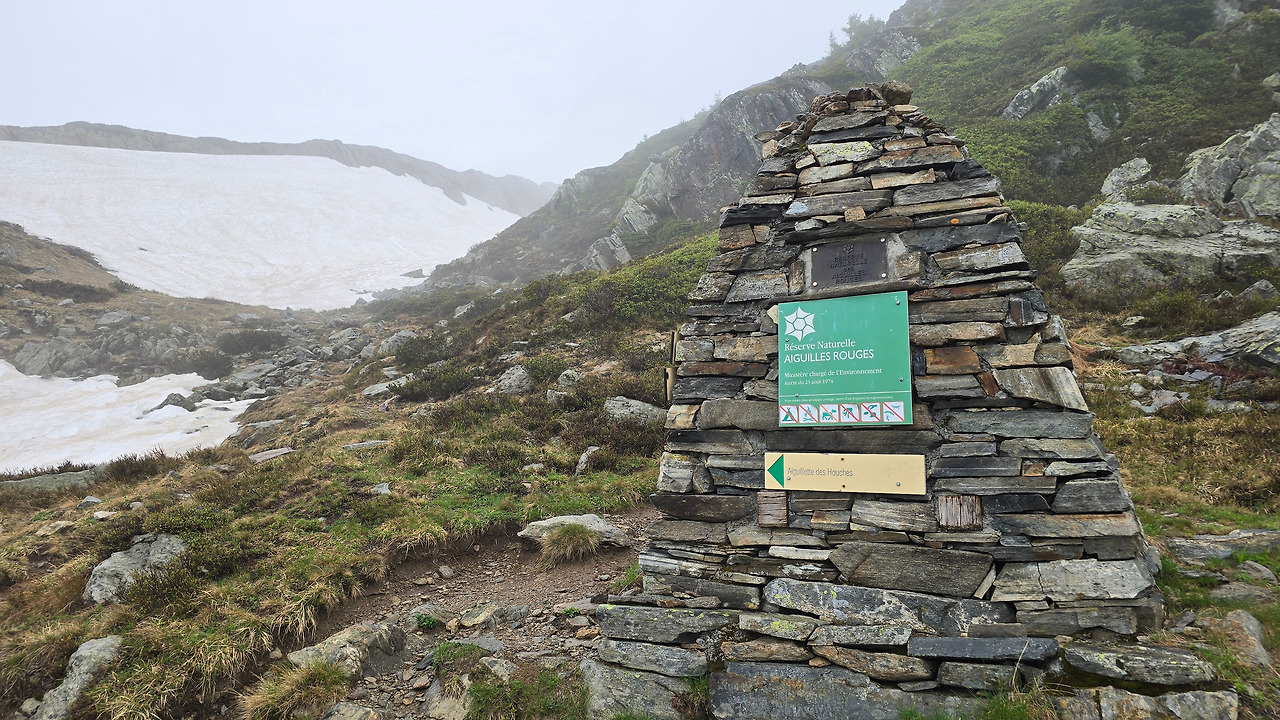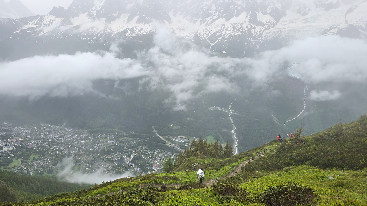가다 쉬다 가다 걷다 도착해 본 산장은 출입 불가. 공사 중인 것 같았다. 뭐 산장에서 맥주 생각이 애초 없었으니 그냥 내려가는데, 가다가 초목 지대를 거치는 것 같았다. 중간에 이정표도 나오고 나서, 여기저기 사방팔방으로 나있는 작은 등산로들이 보이기 시작했다. 이건 제대로 내려가고 있다는 방증이다. 가다 보니 비도 어느 정도 그친 것 같고, 군데군데 물안개인지 구름인지 밀려왔다 사라지는 사이로 에귀이 듀 미디와 몽블랑이 보였다 안 보였다 한다. 사람을 감질나게 만드는데, 이것이 더 기가 막히다. 볼만해서 사진 한 장 찍으려는 사이 구름인지 안개인지 시야를 가리고. 무슨 날씨와 숨바꼭질하는 것도 아니고.