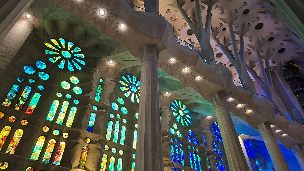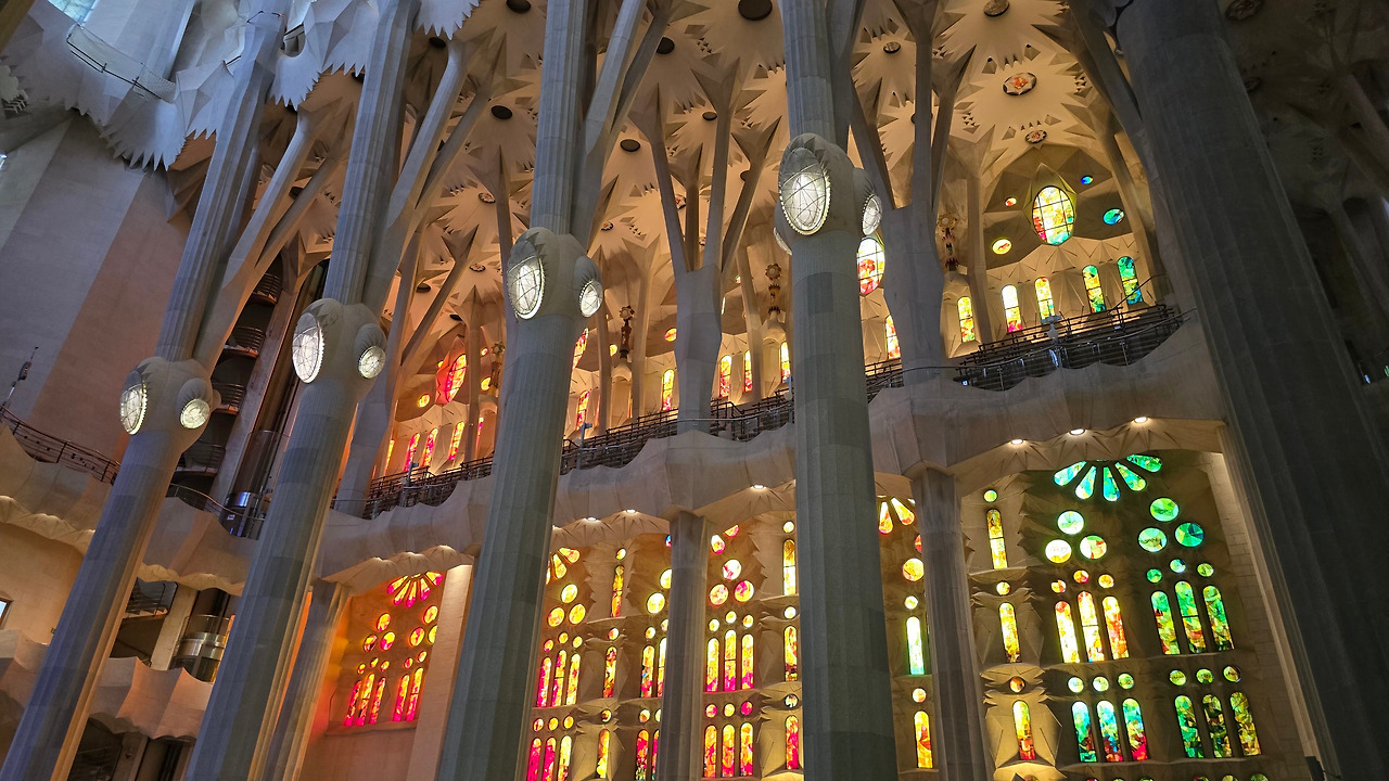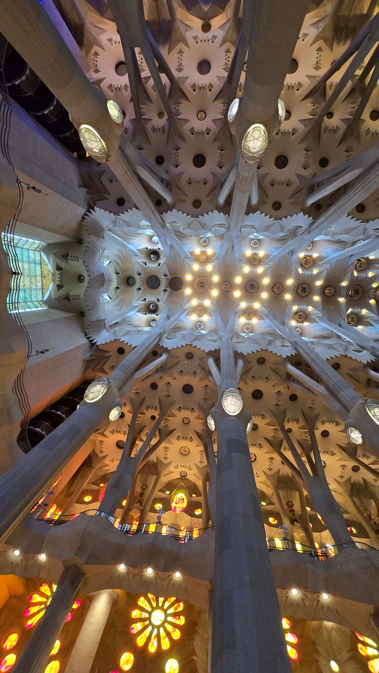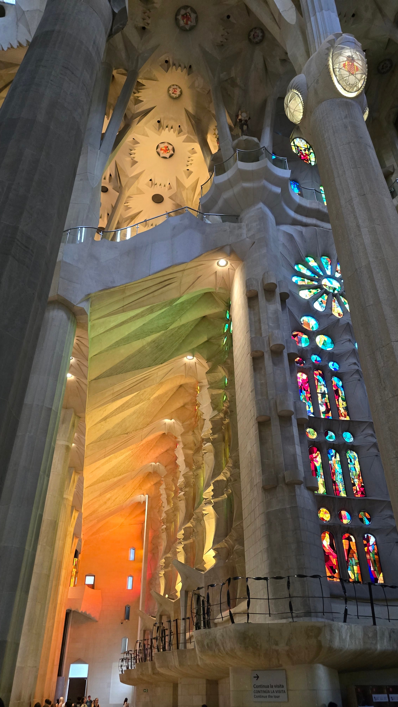 성당 내부로 다시 들어가 보면, 가우디가 몬세라트로부터 영감을 받아 사람들이 숲 속을 걷는 느낌을 주도록 설계를 했기 때문인지, 다른 어느 성당에서도 볼 수 없는 독특한 모습이다. 그건 성당의 기둥과 천장을 보면 금방 확인이 된다. 나무를 본뜬 기둥들과 나뭇잎들을 연상시키는 천장의 모습을 보면 누구든 숲 속을 걷는 느낌이 든다. 여기에 성당에 들어서는 누구든 영적인 묵상과 자기 성찰을 하도록 설계를 했다는데, 그래서인지 스테인드 글라스도 아랫부분은 색감이 진하게 하고, 위로 올라갈수록 점점 밝아지게 했고, 맨 위에는 투명한 유리를 사용하도록 한 것도 왜 성당 내부의 빛이 파스텔톤처럼 보이는지 이해가 된다. 그리고 성당 기둥들은 단순히 디자인만을 위한 목적이 아니라, 세계에서 가장 높은 성당을 세우기 위해 지금까지의 고딕 양식을 대체하는 새로운 건축 구조로 만든 것이라는데, 그걸 알고 나서 성당을 올려다보면 더 높아 보인다.