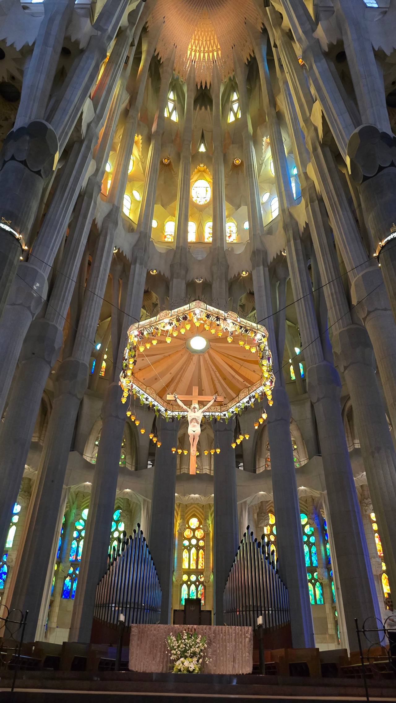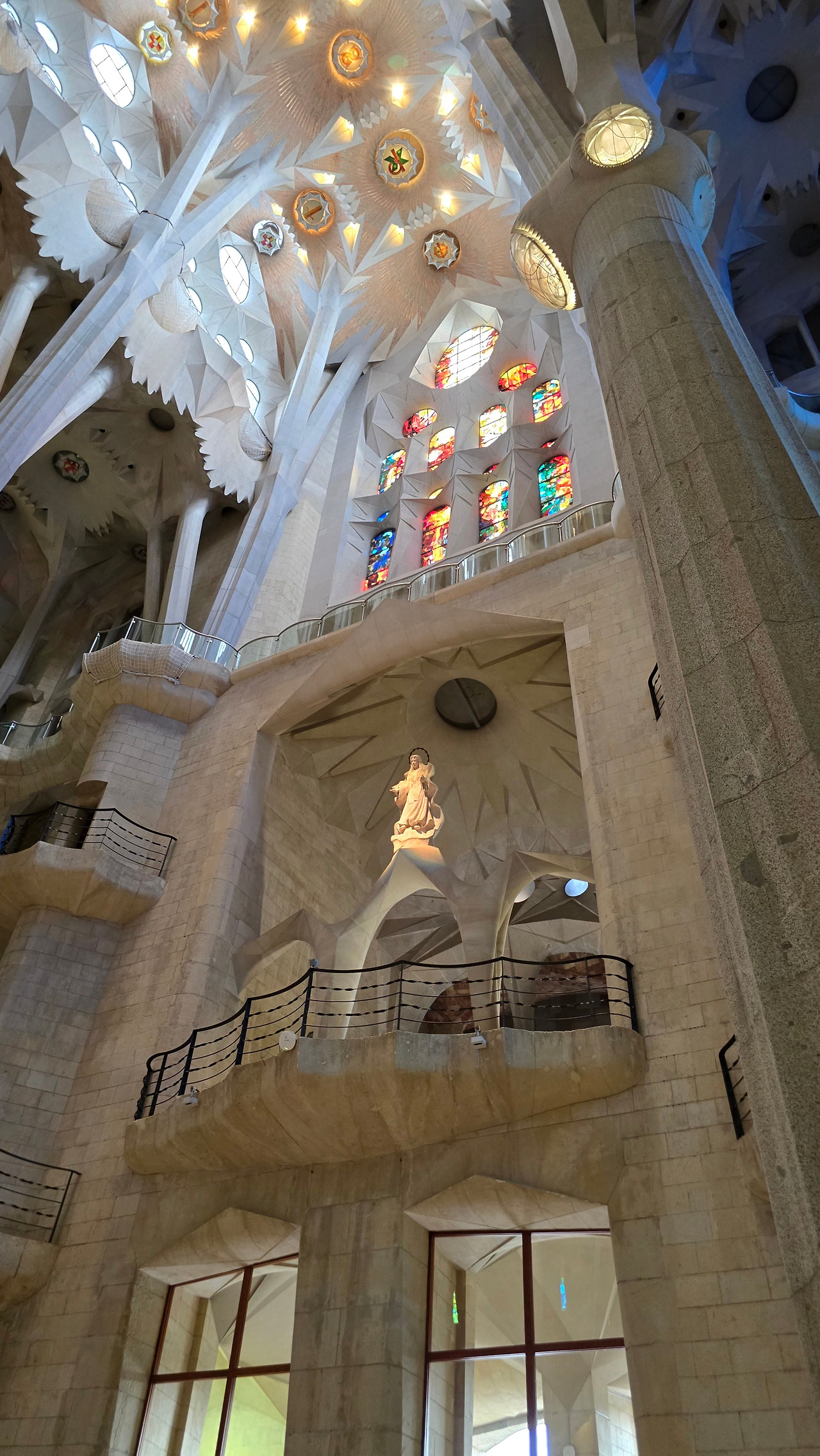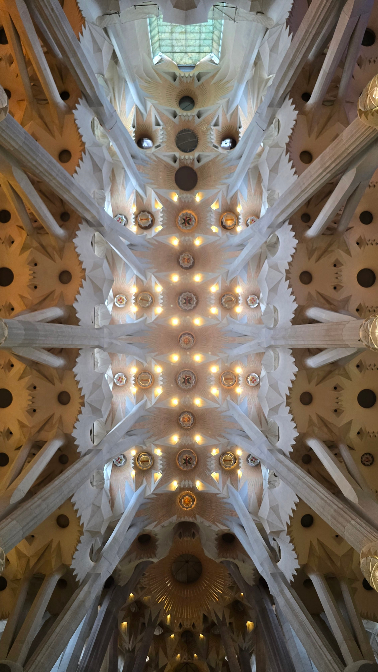 성당 내부로 다시 들어가 보면, 가우디가 몬세라트로부터 영감을 받아 사람들이 숲 속을 걷는 느낌을 주도록 설계를 했기 때문인지, 다른 어느 성당에서도 볼 수 없는 독특한 모습이다. 그건 성당의 기둥과 천장을 보면 금방 확인이 된다. 나무를 본뜬 기둥들과 나뭇잎들을 연상시키는 천장의 모습을 보면 누구든 숲 속을 걷는 느낌이 든다. 여기에 성당에 들어서는 누구든 영적인 묵상과 자기 성찰을 하도록 설계를 했다는데, 그래서인지 스테인드 글라스도 아랫부분은 색감이 진하게 하고, 위로 올라갈수록 점점 밝아지게 했고, 맨 위에는 투명한 유리를 사용하도록 한 것도 왜 성당 내부의 빛이 파스텔톤처럼 보이는지 이해가 된다. 그리고 성당 기둥들은 단순히 디자인만을 위한 목적이 아니라, 세계에서 가장 높은 성당을 세우기 위해 지금까지의 고딕 양식을 대체하는 새로운 건축 구조로 만든 것이라는데, 그걸 알고 나서 성당을 올려다보면 더 높아 보인다.