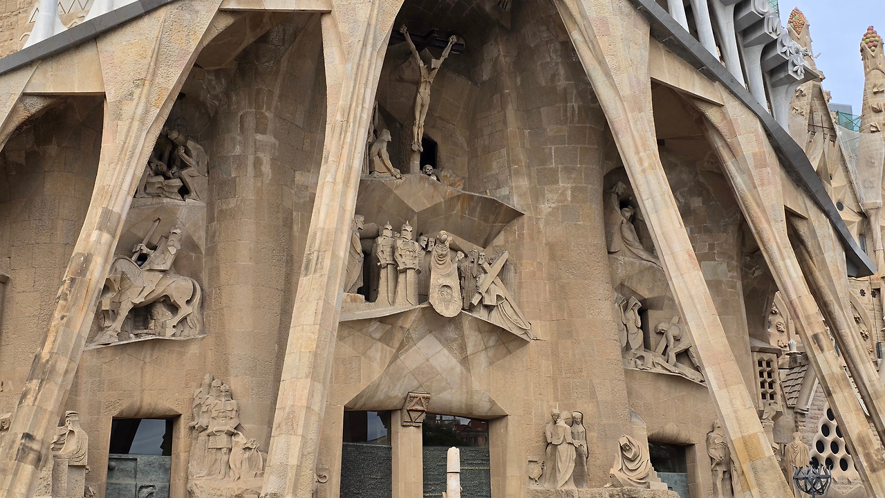 반대편 외부 수난의 파사드로 나와 올려다보니, 이곳 수난의 파사드는 예수가 십자가에 처형되기까지 각각의 장면들을 단순하고 절제된 형태로 표현되어 있다. 예수가 12명의 제자들과 함께한 최후의 만찬, 채찍질을 당하는 모습, 예수를 세 번 부정한 베드로, 십자가를 대신 지고 간 시몬, 그녀 옷으로 예수의 땀을 닦아준 베로니카, 예수의 죽음을 창으로 눌러 확인한 롱기누스, 특히 가장 상징적인 유다의 입맞춤과 예수의 나이 33을 상징하는 마방진까지. 전체적으로 모던(?)한 느낌이다.