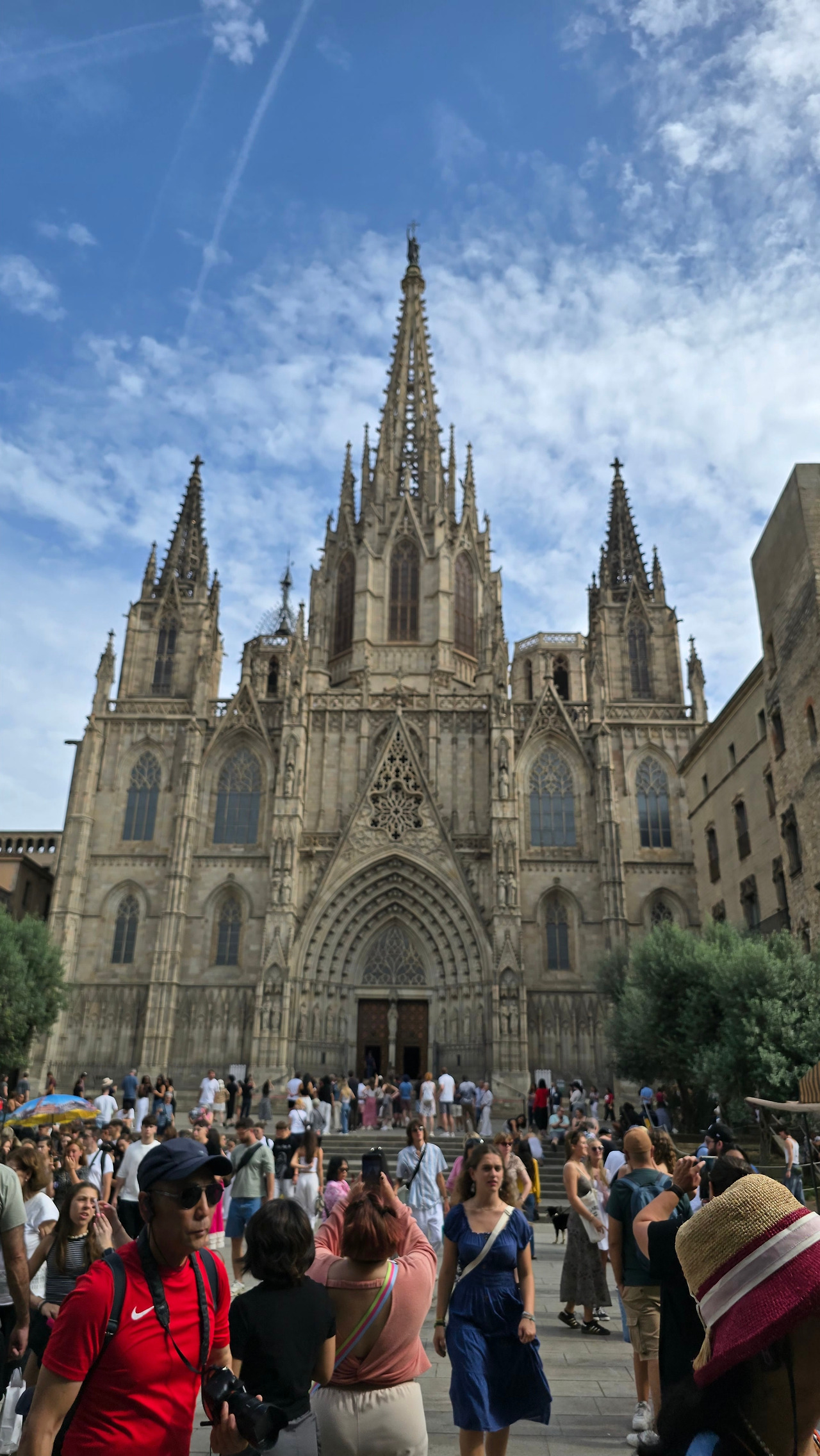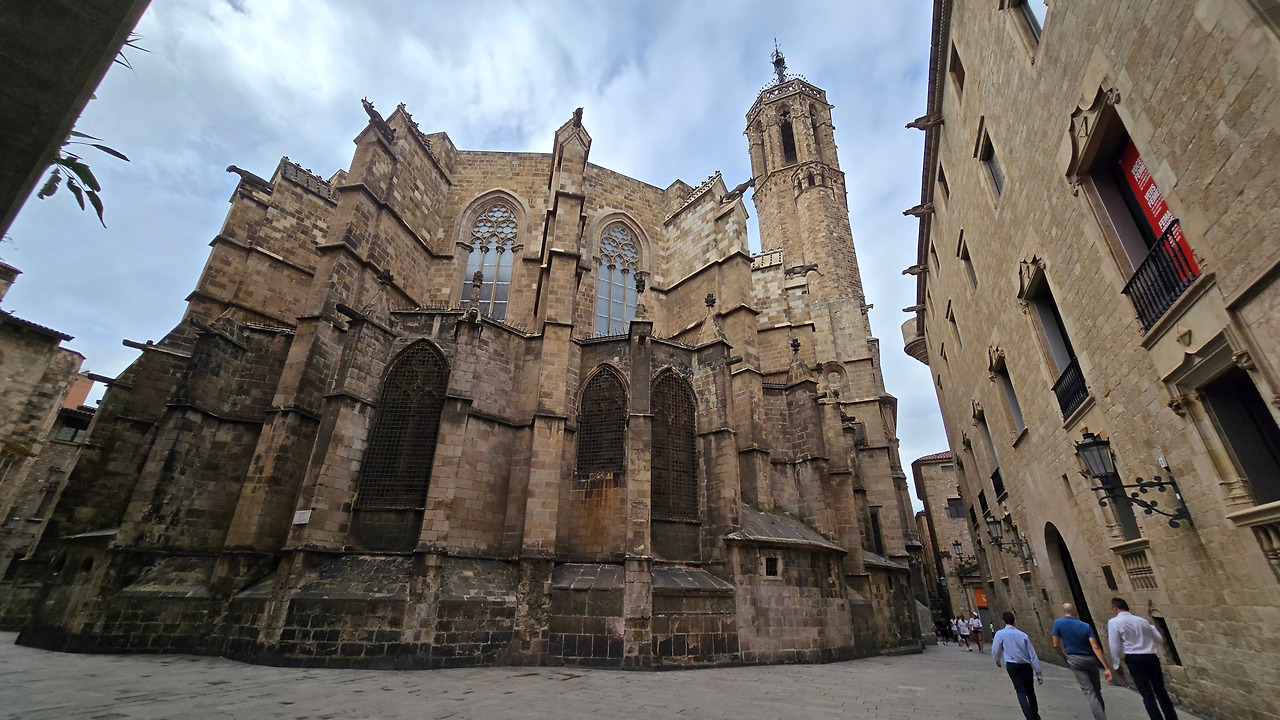 근처엔 피카소 벽화도 있다. 그림을 저 벽에다 직접 그렸다는 건지 어떻게 했다는 건지. 내용은 카탈루냐 전통인형인 거인인형과 라 메르세 축제에 등장하는 인간탑 쌓기 모습을 나타낸 것이라는데, 유치원 아이들이 그린 그림이라고 해도 믿을 것 같다. 대가가 그리니 향기가 절로 날까? 이러니 유명하긴 유명해져야 한다. 그건 그렇고, 역시나 고딕 지구 터줏대감은 대성당이다. 성당 앞은 항상 사람들이 넘쳐났다. 그곳에서 버스킹도 하고, 추억도 카메라로 열심히 만들고. 성당을 정면으로 왼편 골목으로 가면 성당 뒤편을 볼 수 있다.