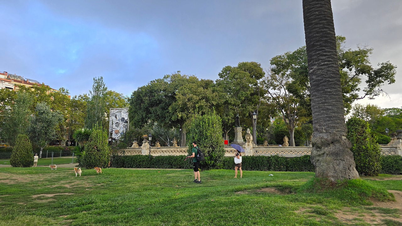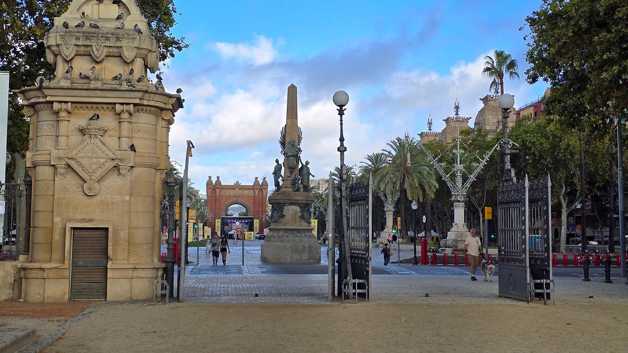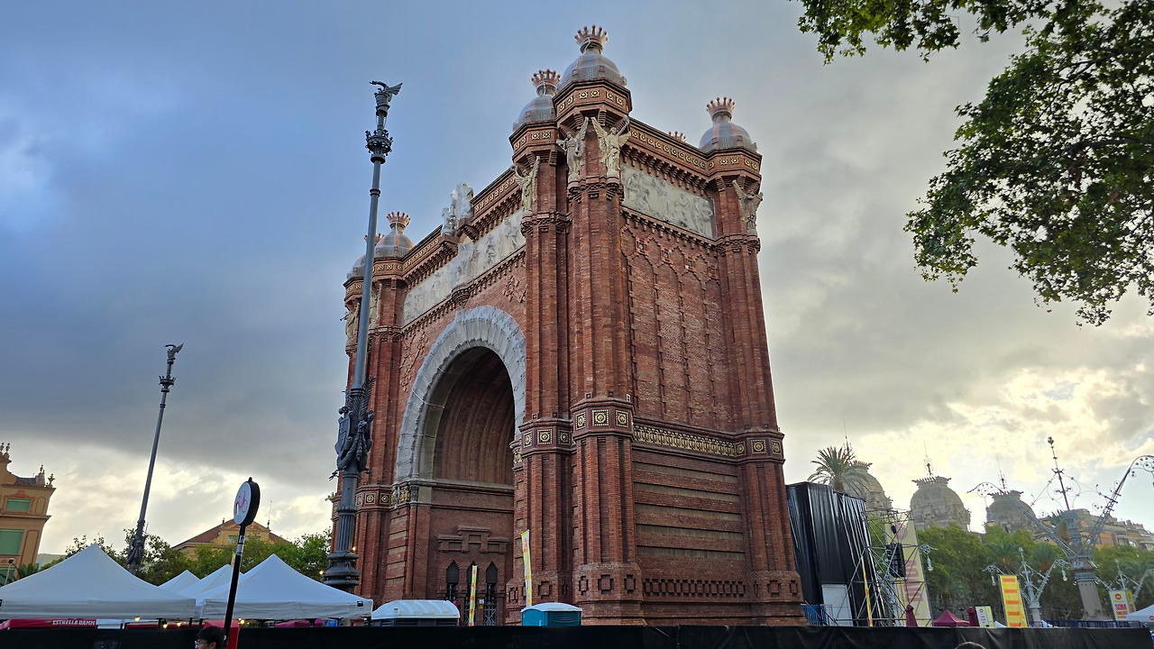 괘도를 수정하고 방향을 틀어 앞으로 가니, 그때 아리따운 문이 하나 보였다. 이렇게 얘기하니 작은 문 같지만 아니다. 이문은 1888년 바르셀로나에서 만국박람회를 열었는데, 문을 주 출입문으로 사용했다는 그 개선문(Arc de Triomf)이다. 아마, 만국박람회를 기념해서 지은 건물 같았는데, 문이 주는 색감이 오늘처럼 비가 올락 말락 끄물끄물한 날씨와 딱 맞는다. 로마에 흔한 개선문들처럼 심오한 역사를 지니지 않았지만, 눈 높은(?) 내 눈에 딱 맞는다. 그 앞을 지나니 넓은 광장이 연결되어 있고 왼편에 호텔인 것 같은 건물이 서 있는데, 세 쌍둥이인가? 미적으로 주변과 조화롭다. 그곳을 좀 더 걸어가니 공원 입구가 나왔다.