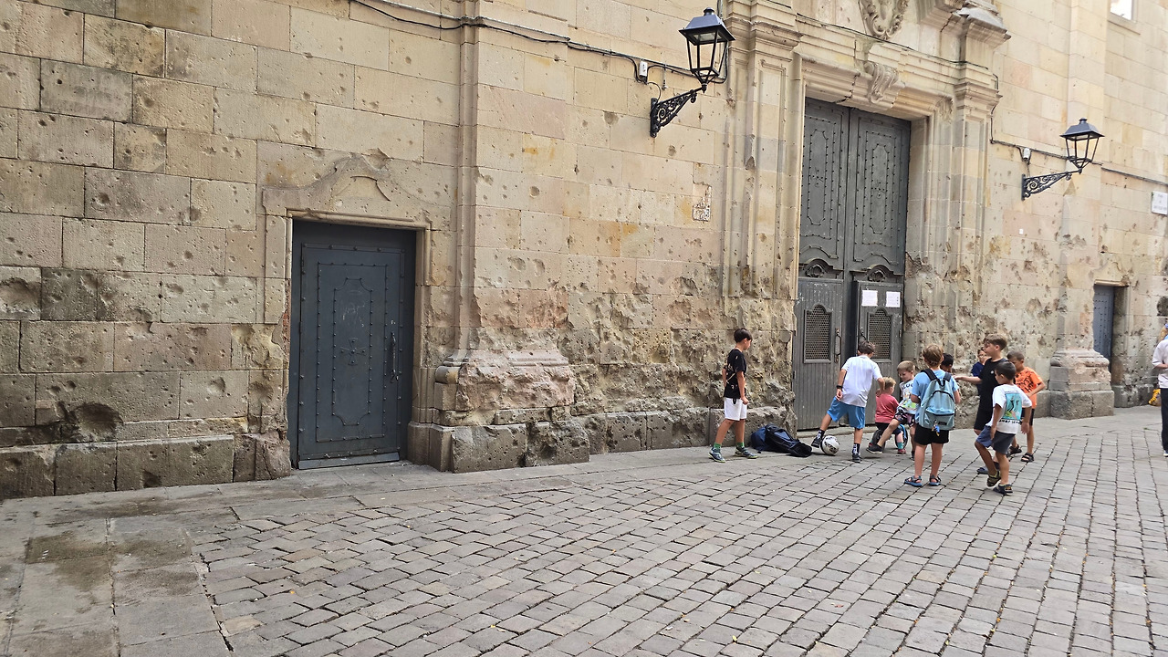 스페인 내전 당시 이곳에 폭탄이 떨어져 많은 아이들이 희생을 당한 곳이다. 벽에는 그 흔적이 고스란히 남아있어서 전쟁이란 어떻게든 상흔을 남긴다고 느꼈을까? 폭탄이 떨어졌는데 유독 아이들이 희생을 많이 당한 이유도 가보면 알게 된다. 그곳에 초등학교가 있다. 사방이 거의 막혀있는 아늑한 공간에 독재자 프랑코가 민간인 48명을 학살한 곳도 이곳이라는 생각이 미치면 뭔가 의미를 부여해야 할 것 같은데, 가보니 전혀 아니었다. 시골 장날 장터 같았다.
