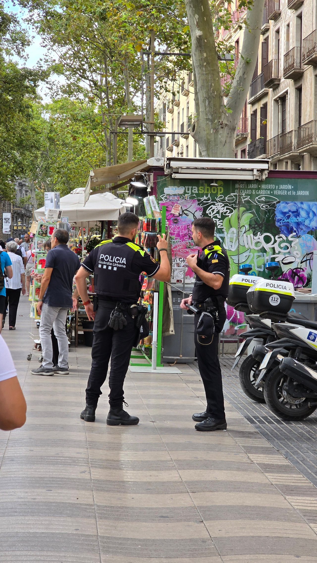 그러니 며칠 전에 왔던 같은 장소가 다르게 보였다. 앞쪽 골목엔 학생들이 꽉 차서 무슨 행사를 위해 대기 중인가? 더 지켜보려다, 나그네는 길에서 멈추지 않아야 해서 앞으로 나아갔다. 사람 많은 람블라(La Rambla) 거리로. 어찌 보면 아주 특별할 것 없는 이곳 거리가 왜 사람들을 불러 모으는 걸까? 지금 한쪽 차로가 공사 중이었다. 사람들이 오가는데 공사까지 더하니 정말 분주했다.