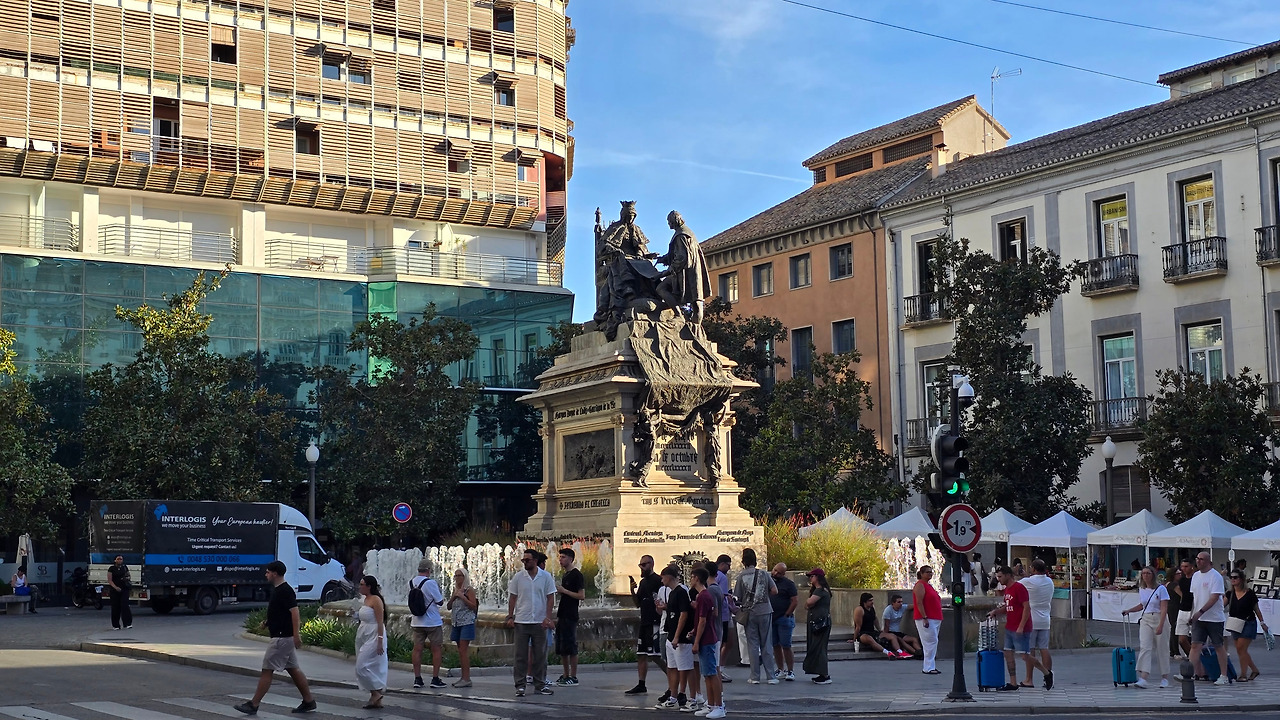 알람브라 궁전은 내일 보기로 했으니, 그럼 오늘 일정은 정해졌다. 크게 시내 탐방과 산 니콜라스 전망대 가기. 시내? 시내라고 하기엔 작아서, 그래도 여긴 그라나다 주정부 소재지이다. 있을 건 다 있다. 오다 보니 시청도 봤고, 좀 지나서 눈에 확 띄는 동상도 있다. 이사벨 라 카톨리카 광장에 있는 항복 기념비(monumento a las Capitulaciones). 누가 누구한테 항복을? 누군가에겐 비참한 역사라니. 콜럼버스가 무릎을 꿇고 있어서 그가 항복하는 건 아니고. 세비야 대성당에 가면 그의 무덤이 붕 떠있는데, 그건 그때 가서 얘기하자. 좀 걸어가니 누에바 광장이 나온다. 이것이 광장? 작다고 무시 마라. 그 앞에 법원도 있다. 이런 선입견은 다로 강까지 이어진다.
