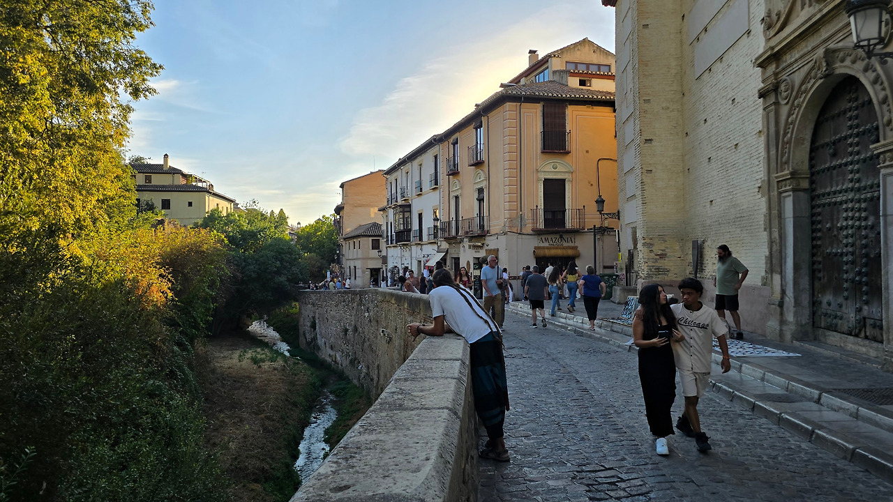 다로 강(Rio Darro). 이걸 강이라고 해야 할까 싶지만 강이다. 왜냐고? Rio가 강이다. 작고 좁아서, 시냇물 같아서 그렇지 아주 먼 곳까지 흐른다나 뭐라나. 그런데, 강인지 아닌지를 떠나 강을 중심으로 계곡이 형성되어 있는 건 지리적으로 중요하다. 강이야 이슬람 왕국 시절 식수로 사용되었기에 중요했고, 오른쪽 높게 솟은 계곡은 요새로도 안성맞춤이다. 이곳에 알람브라 궁전을 세운 이유가 이해가 된다. 궁전 바로 앞에, 다로 강에서 올려다보면 맨 앞쪽에 알카사바, 요새를 세운 것이다.