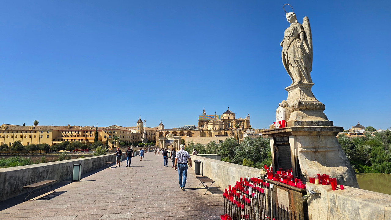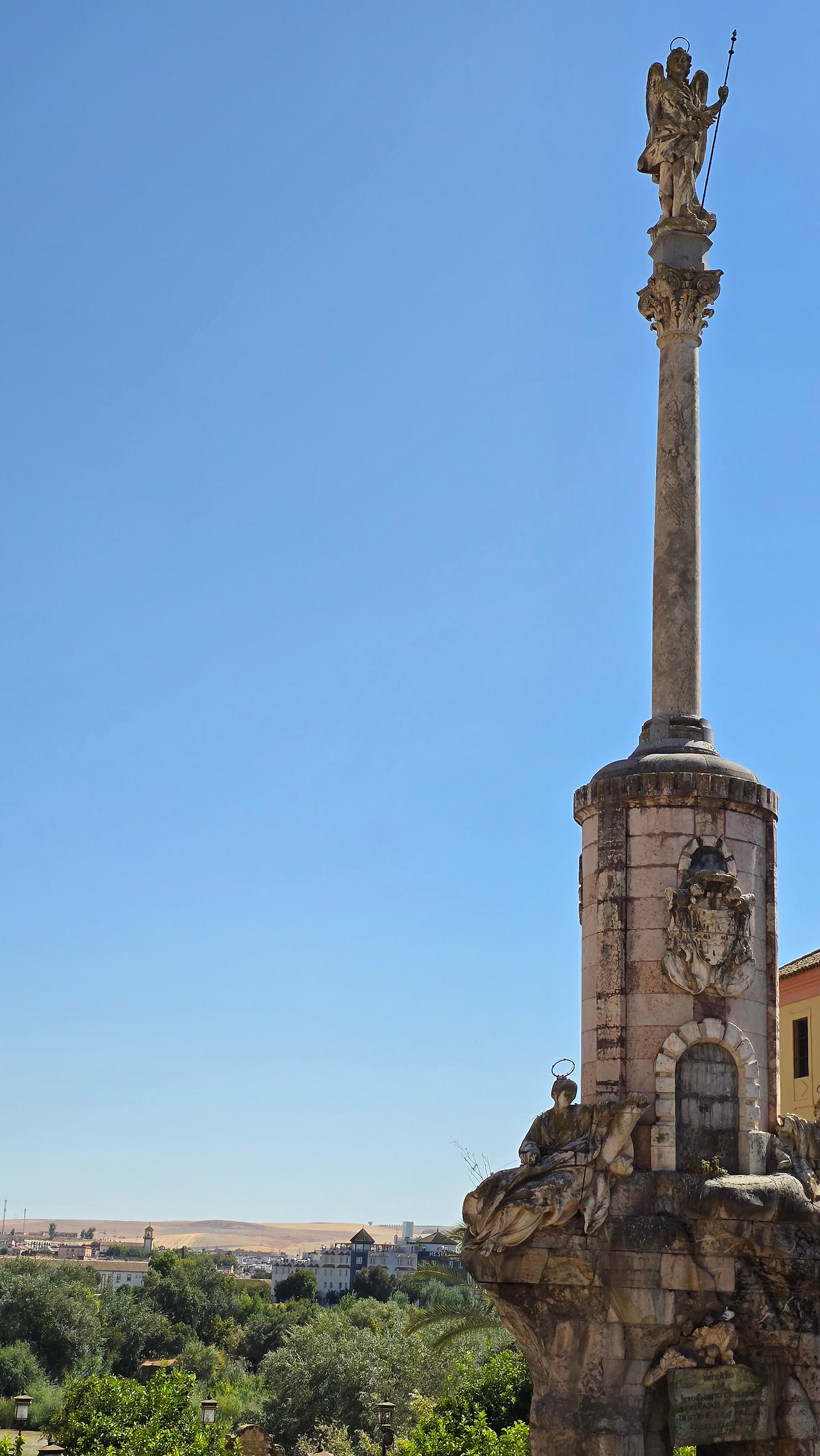 메스키타를 돌아보면 입구 쪽 벽면이 아름답다. 그걸 보다 걸으면 로마 다리 앞 승리의 광장에 이른다. 그 옆에 멋진 성 라파엘의 승리의 탑이 있고, 앞쪽에 로마교로 가는 다리 입구가 있다. 로마 다리는 기원전 1세기에 세워진 것이라는데, 기원전이란 시간대가 이해가 안 된다. 그냥 아주아주 오래된 다리? 그런데 아직도 다리로 기능한다. 걷다 보면 중간에 성 라파엘 대천사 동상이 나오는데, 다리 입구 쪽에도 성 라파엘의 승리의 탑도 있는 걸 생각해 보면, 성 라파엘이 코르도바의 수호천사여서 그런 것이다. 로마 다리 끝에 칼라오라 탑이 있다. 방어를 위한 요새였다는 그 탑.