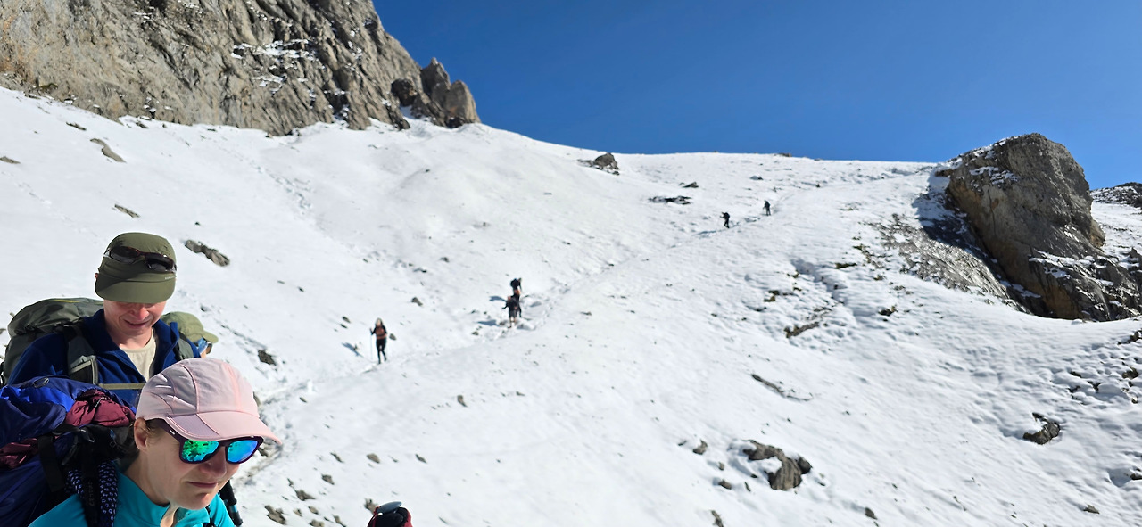 이런 생각도 하며 고개를 넘으니 중간중간에 눈이 많이 쌓인 지역이 나왔다. 지금까지 멀리서 보이던 설산 중 한 곳에 들어선 것이다. 급경사를 오르고 다시 내리막을 거쳐 완만한 지형을 이리저리 걷다 보니 아주 드넓은 들판이 내려다보였다. 그곳이 페다베호였다. 움푹 꺼진 그곳은 지반이 침하되면서 생겨난 지형으로, 만약 그곳을 물로 채운다면 배가 오갈 것 같은 느낌이 들 정도로 아주 광대했다. 그래서 운하라고 칭했던 걸까? 그렇게 운하라 불리는 그곳 맞은편이 코랄디나스 절벽이었다. 거대한 바위가 통째로 눌러앉은 것 같은 직벽에 가까운 모습. 그때까지 그 절벽을 따라올라 걷는 줄 몰랐다. 멀리서 보니 절벽 밑에 하얀 실선처럼 보이는 길로 가는 줄 알았는데, 나중에 알아보니 그 길은 푸엔테 데로 가는 길이었다. 오른편으로 페다베호를 끼고 끝까지 걸으니 이정표가 나왔다. 아까 뒤에서 봤던 곳까지 걸어온 것이다. 오른쪽으로 가던가 위로 올라가던가. 선택지는 두 개였다. 위로 올라가? 나중에서야 위로 절벽을 넘는 건 아니고 그 절벽을 따라 왼쪽으로 걸어야 오늘 예정된 숙소에 도착할 수 있었다. 그곳에서 절벽 쪽으로 올라갈 때 까지만 쫄지 않았다. 우리 일행보다 앞서서 여성 두 명이 스틱도 없이 우리 앞을 휘리릭 지나갔기 때문이다.