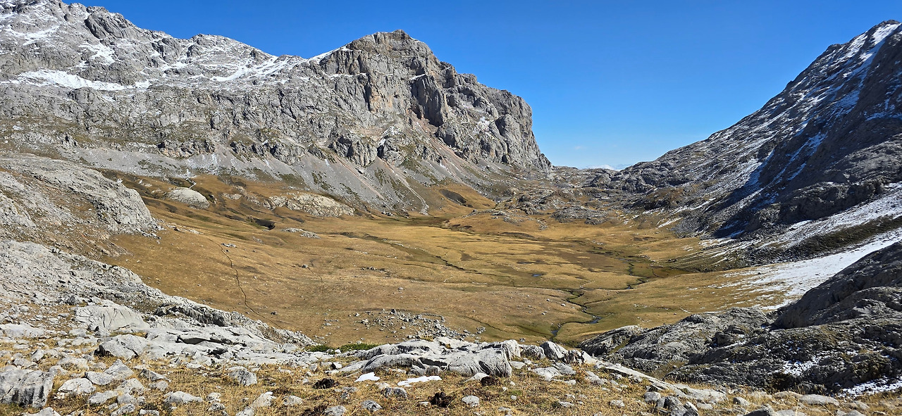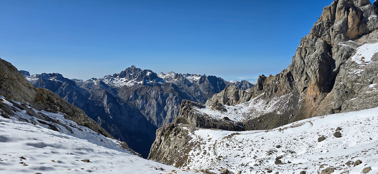피코스 데 에우로파에 몇 개의 대피소 혹은 산장이 있는지 잘 모른다. 시설이 좋고 나쁘고를 떠나 오늘 머물 대피소는 시그니처 대피소로 알려져 있다. 도대체 얼마나 멋지기에. 숙소를 나서 걸을 때 순탄했다. 산 쪽으로 난 길을 걸어가니 그 길 이름이 판데트라비 패스였다. 그걸 따라 좀 더 걸으니 목장이 나왔다. 아마 소를 키우는 곳 같은데, 휑했다. 겨울맞이를 위해 소를 산 아래로 옮겼나? 아무것도 없는 곳을 지나 한참을 걸으니 저 멀리 산맥 사이로 급경사 언덕길이 보였다. 그곳에 도착해서 가파른 그곳을 낑낑거리고 올라가는데, 누가 내려오고 있었다. 독일에서 왔다는 젊어 보이는 그는 혼자 걷는 중이라고 했다. 기개가 대견했다. 내가 그처럼 젊었어도 혼자 왔을까?