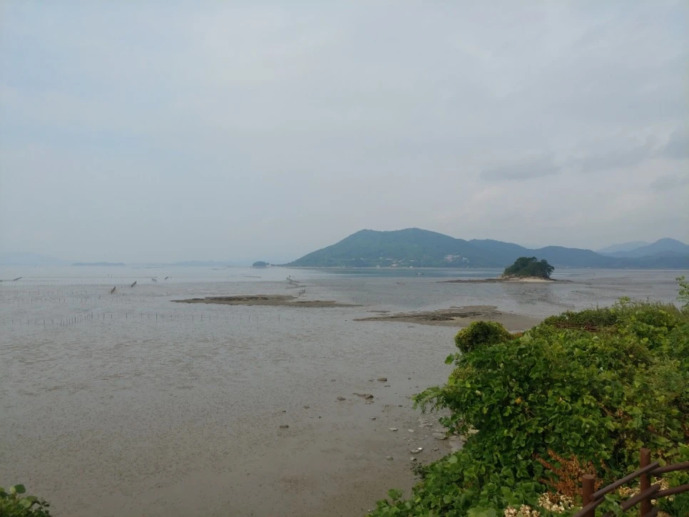 저 멀리 솔 섬 이 보이는데, 그게 포인트다. 와온해변의 포인트. 해변이 주인인데, 주인 같지 않다. 섬이 주인공 같은데, 부창부수라고 둘 중에 하나 빠지면 안 될 것 같다. 섬이 있어 해변도, 해변도 섬이 있어 뻘이 얼마나 넓은지 더 쉽게 알게 해 준다. 저 섬이 없었으면, 그저 그런 바닷가였겠지만, 솔 섬 이 이곳 정취를 끌어올린다. 와온마을도 마을이지만, 이 작은 언덕 또한 키포인트다. 내려다보니 모든 게 시원시원하다. 제대로 찾아온 것이다.