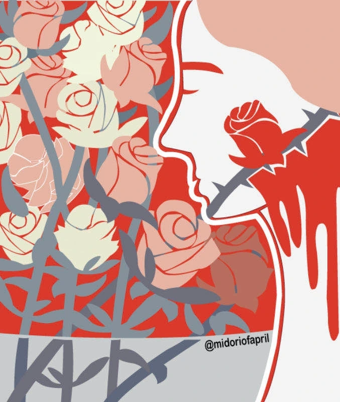 창문 넘어 가로등 불빛을 바라보고 서있는 장미꽃들이 서로 좁아터진 꽃병 안에 몸을 짓 이겨 넣은 채로 소나기를 생각한다. 마치 억지로 붙여놓은 것처럼 단단하고 촘촘히 맺혀있는 빗물들에 꽃잎들이 전율한다. 꽃을 두 손으로 움켜쥐고 병에서 꺼내 마침내 바닥에 풀어놓았다. 가시에 찔리고 피가 난다. 밤을 맞이하는 장미의 짙은 분홍빛과 빗물을 등진채 고개 숙인 잎들.