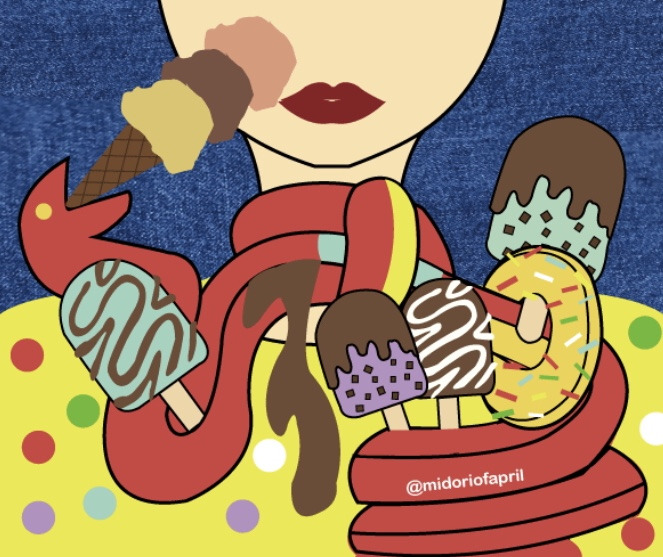 뱀이 허물 사이사이에 온갖 도넛과 과자들을 끼운 채 스멀스멀 기어올라 온다. 내 목에 꽈리를 틀 때 떨어지는 설탕 부스러기가 달콤한 향을 풍긴다. 뱀의 허물 위에 아이스크림이 녹아내리고 내 머리에 통증이 인다. 허물 사이사이에 끼워진 달콤한 아이스크림들이 나를 노려보고선 얼른 집으라 말한다. "그래, 한 입만, 딱 한 입만 먹어야지."