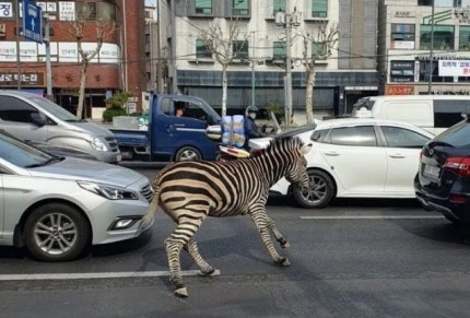 처음엔 합성 사진인줄 알았다. 주택가 골목 귀퉁이에서 오토바이 배달원과 마주 서 있는 얼룩말이라니. 도심 속 차도 사이를 달리고 있는 얼룩말이라니!