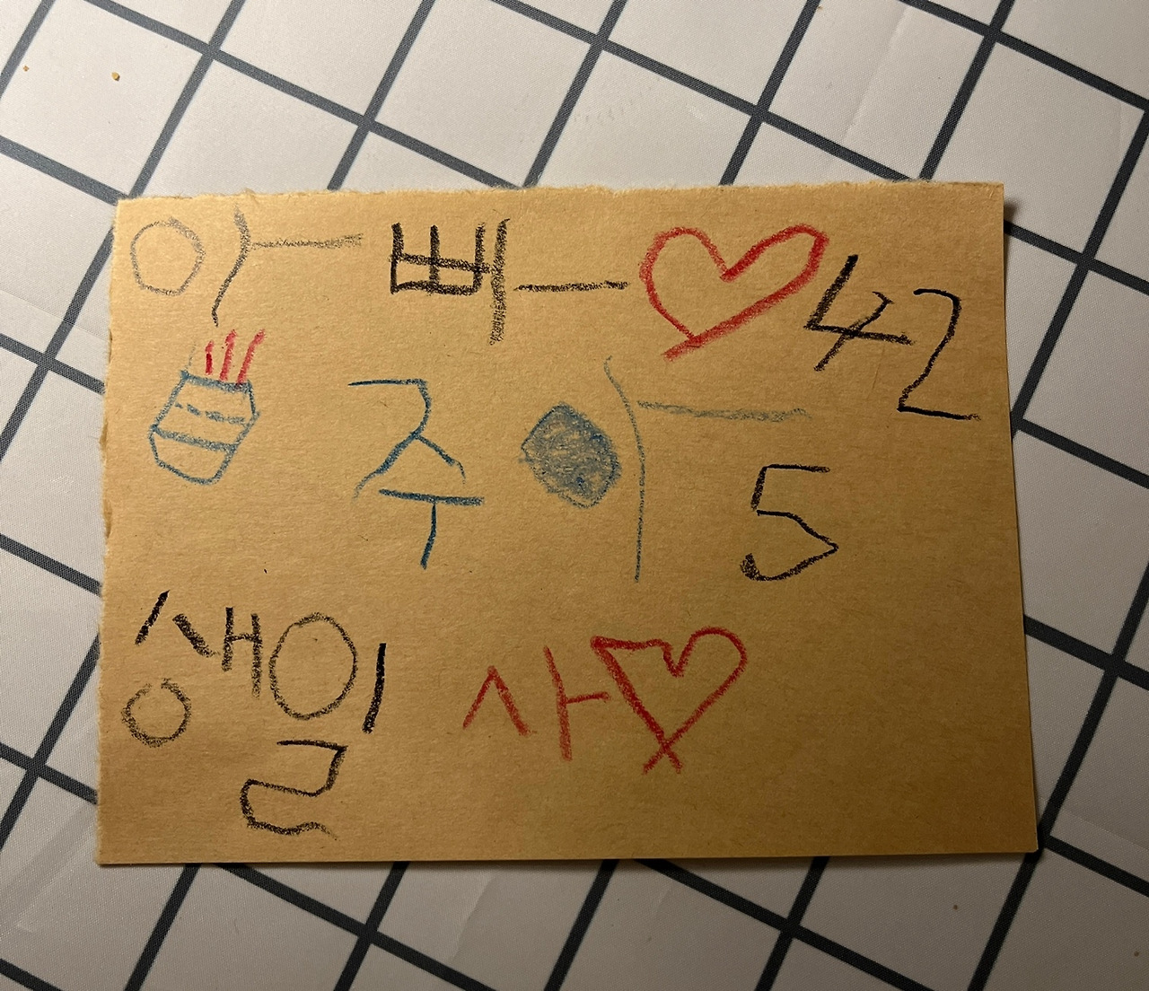 아내와 주아가 계획한 생일 이벤트였다. 케이크는 낮에 산 마카롱으로 만들었고 주변은 시리얼로 장식했다. 엄마랑 편지도 만들었다. 아빠, 주아, 생일, 나이를 나타내는 숫자 그리고 사랑을 쓰려다 랑 자가 어려웠는지 사 옆에 하트 모양이 그려진 편지였다. 나는 한참 동안 주아와 편지를 번갈아 봤다. 올라간 입꼬리는 좀처럼 내려올 생각을 않는다. 우리는 마카롱처럼 작지만 달콤한 파티를 했다.