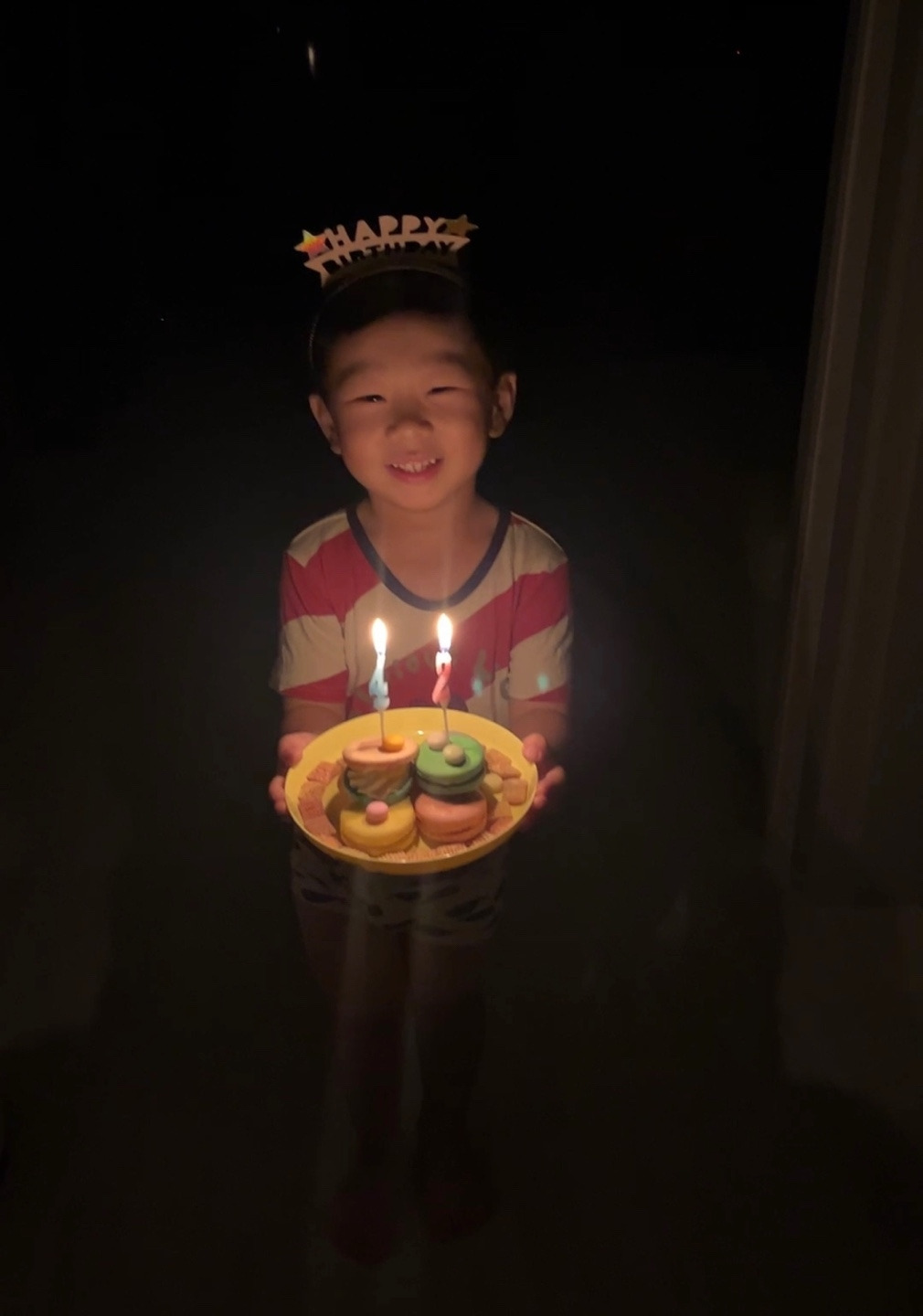 주아가 어둠 속에서 초가 켜진 케이크를 들고 나타났다. 해피버스 데이가 쓰인 머리띠를 두르고 작은 목소리로 노래를 불러줬다.