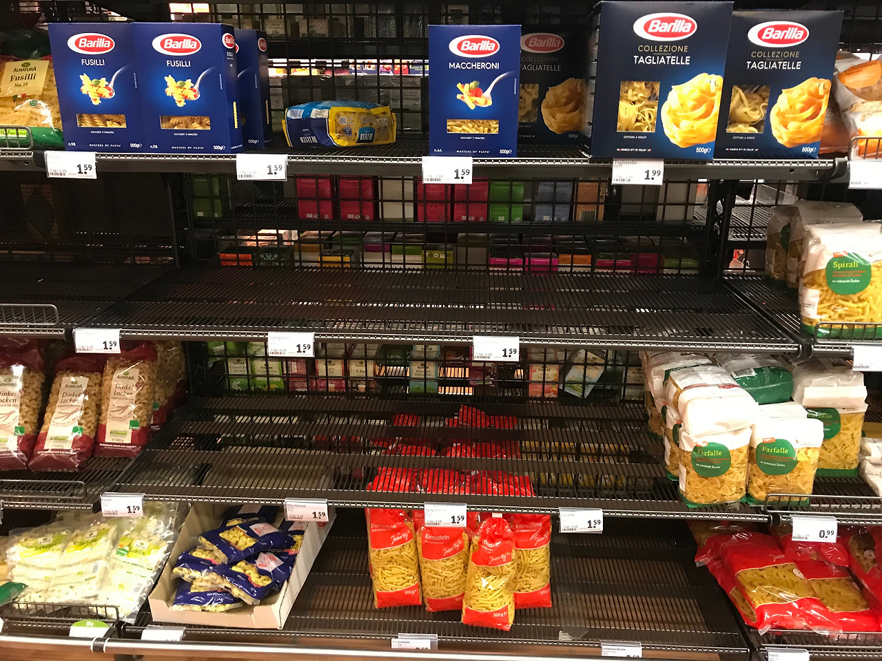이 날은 일부러 조금 더 걸어 시내에 있는 큰 슈퍼마켓에 가보았다. 제일 먼저 휴지 코너로 가보았는데 키친 타올까지 포함해 텅텅 비어있었다. 휴지를 대체 왜 사재기 하는 걸까? 정말 모르겠다. 한국 일부 언론에서는 여기 사람들이 휴지를 마스크 대용으로 써서 없어진 거라고 설명하기도 하던데 휴지를 마스크 필터로 쓰는 사람은, 적어도 내가 아는 사람 중에는 없다. 독일인들을 붙잡고 물어봐도 모른다. 개인적으로 추측하기엔, 무언가 내가 알 수 없는 이유로 최초에 휴지를 사재기한 세력(?)이 있고 휴지대신 손과 물로 뒷처리를 해야할까 무서운 사람들이 휴지가 보이는 족족 사가는 바람에 마트에 계속 휴지가 비는 악순환이 되는 것 같다.