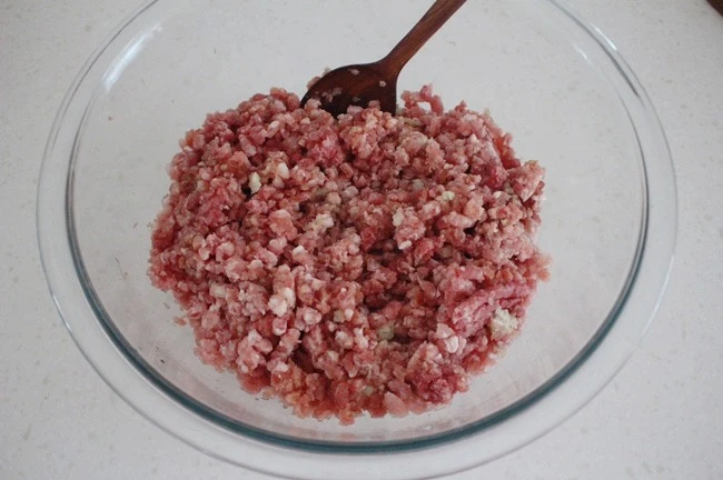 ① 다진 고기에 간장, 소금, 후추, 맛술, 다진 마늘을 넣어 미리 재워둔다.
