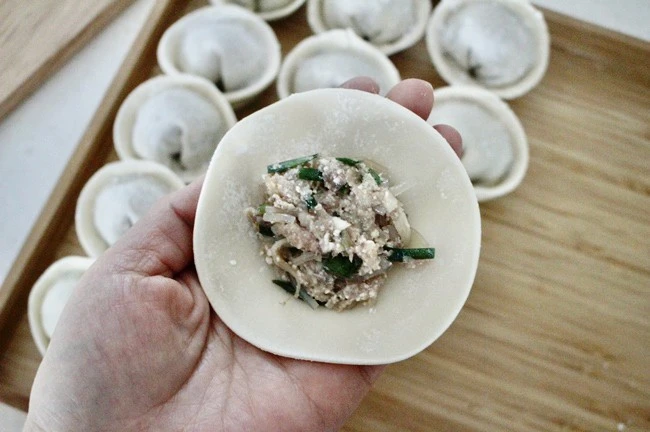 ⑤ 만두피 가운데에 만두소를 적당히 올린 후, 만두피 가장자리에 물을 발라주며 이쁘게 빚는다.