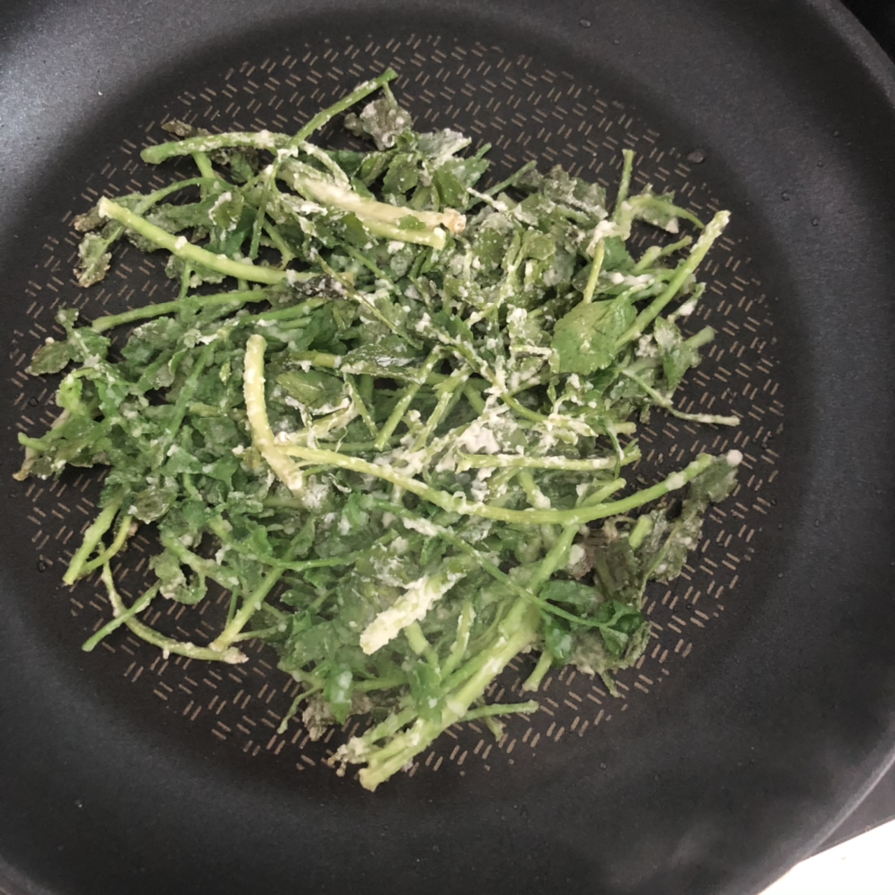② 뜨겁게 달군 프라이팬에 기름을 넉넉히 두르고 중불로 낮추어 미나리전을 부친다. 반죽이 거의 없는 상태이므로 모양을 동그랗게 잘 잡아준다.