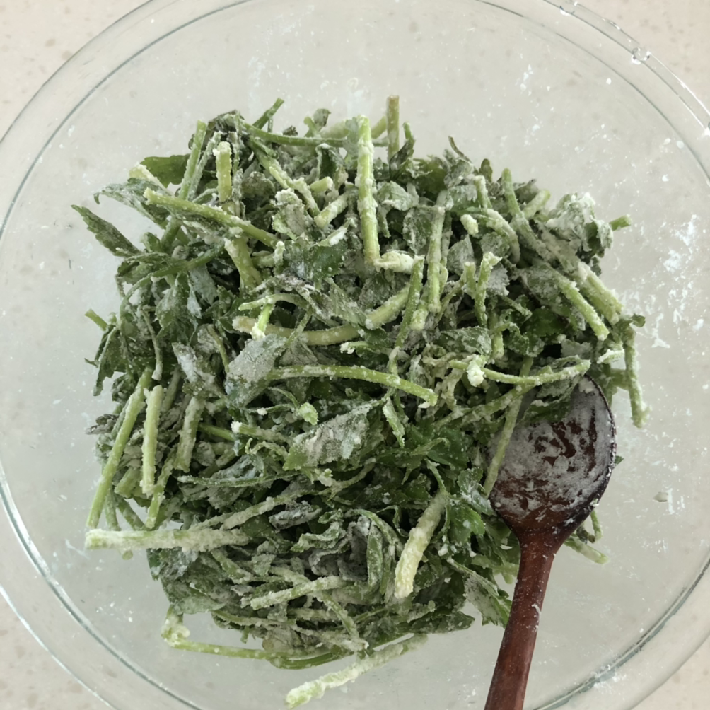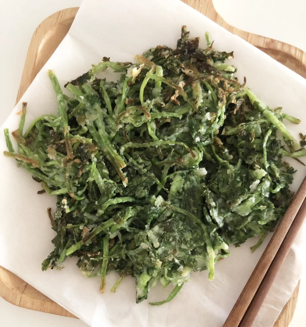 ① 미나리 한 단을 깨끗하게 씻어 물기를 조금 털어낸다. 먹기 좋은 크기로 자르고 부침가루와 쌀가루 1:1 비율로 옷을 입혀준다.