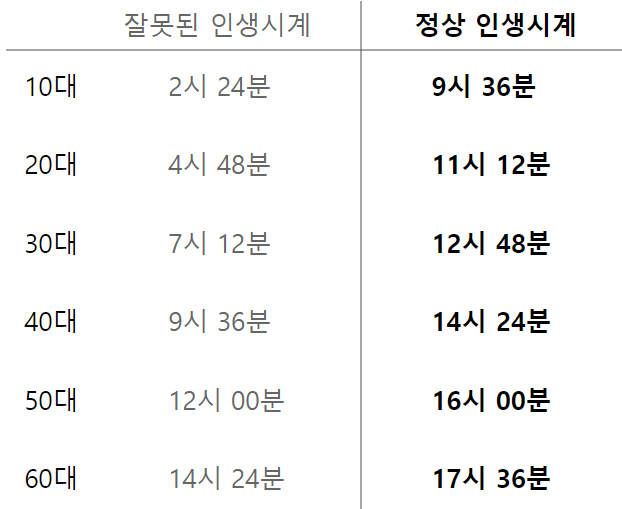 잘못된 인생시계와 정상 인생시계의 나이대를 비교해 보면, 40대는 아침 시간이라는 위로가 얼마나 어처구니없는 사기였는지 알 수 있습니다. 무조건 당신은 아직 젊다 당신은 아직 할 수 있다는 얘기를 하려다 보니 잠을 안 자는 사람의 스케줄을 만들어놓고 심지어는 하루 시작을 00시에 시작하는 사람의 스케줄로 만들고 당신은 이제 막 아침을 시작했다고 하니 잘못된 표현이 되었습니다.
