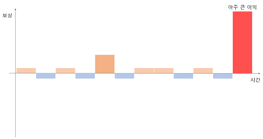 소소하게 이익과 손실을 보다가도 운이 맞아떨어지는 시기에 '아주 큰 이익'을 보는 것이다. 유튜버를 예로 들어보자. 유튜버는 대체로 한두 개의 콘텐츠가 소위 '떡상'을 만들어내고 그 시점부터 인기와 수익 구간이 확 높아진다. 그전까지는 수익 창출은 안 되고 영상에 시간과 노력을 넣었고 그것에 대한 기회비용이 있으니 '약한 손실'이 계속 발생한다. 물론 그 과정에서 편집 실력이 좋아진다던지 좋은 댓글을 받아 기분이 좋아진다던지 '약한 이익'을 보기도 한다. 이런 기간을 끈기와 실력, 그리고 태도로 버티면 떡상이 운 좋게 발생한다.