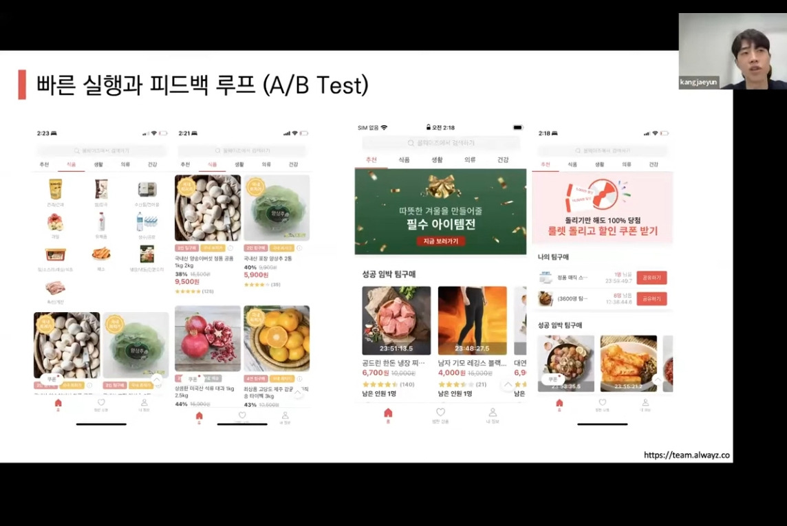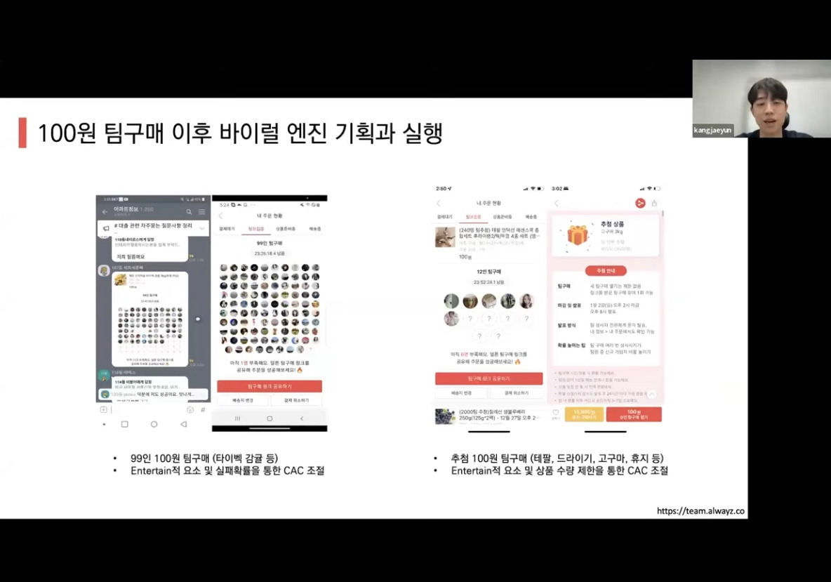 - 99인 100원 팀구매 ( 타이벡 감귤 등) ,소수의 99명을 모은 팀에게만 100원 혜택 제공하여 전체 CAC 낮추기 위해 노력