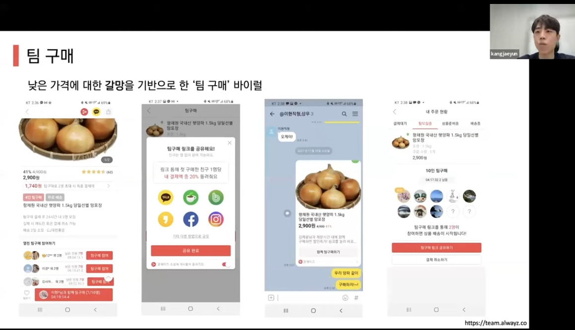 - 카카오톡, 카페, 밴드 , 오픈 카톡방 소셜 공유를 통해 친구 연결, 팀 구매 진행