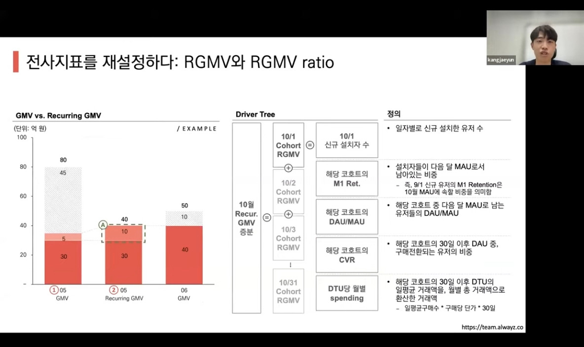 - RGMV : 지속가능한 거래액, 해당 월의 신규 설치자 수가 그 다음달 잔존율, 재 방문율, 구매전환율을 기반으로 반복 구매 예상 금액 추정