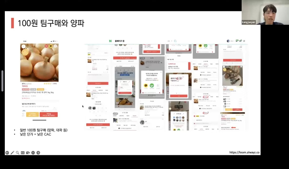 - 평균 CAC 15000 원, 차라리 제품 100원 딜을 통해 CAC를 6000원 대로 가져갈 수 있는 핵심 아이템을 찾아보자. > 일반 100원 팀구매 진행 (양파, 대파 등)
