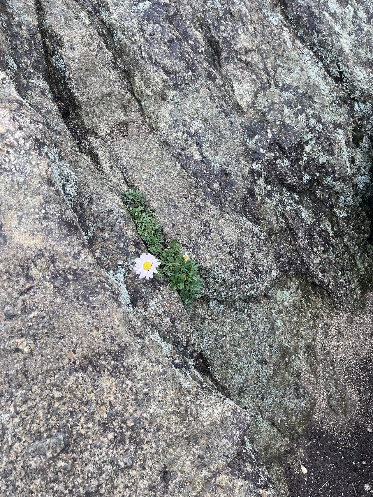 그렇게 우리만의 속도로 천천히 나아갔습니다. 지나가다 보이는 야생 꽃들에 눈길을 한 번 주기도 하고 잠시 멈춰 이름을 찾아보기도 했습니다. 보라색 꽃이 어딜가나 보여 궁금했는데 이름이 투구 꽃이라고 합니다. 가까이서 보니 투구를 쓴 장병처럼 온 몸을 비틀어 자신을 지켜내고 있는 것만 같았습니다. 그렇게 한참을 가다 노인봉에 다다랐을 때 쯤 바위 사이 분홍빛의 꽃에 시선을 빼앗기고 말았습니다. 척박한 그 돌 위에서도 자신의 뿌리를 내리고 고개를 꼿꼿이 들고 있는 자태는 담백했고 단단했습니다. 바위에 꽃씨가 불시착했다 해도 정착할 틈을 찾고 그 안의 흙을 끌어안아 뿌리를 내린 이 꽃처럼 살아가자고 다짐했습니다. 내 뜻대로 되지 않을 때 상황 탓으로 돌리며 쉽게 포기했던 못했던 지난 날들이 부끄러워졌습니다.