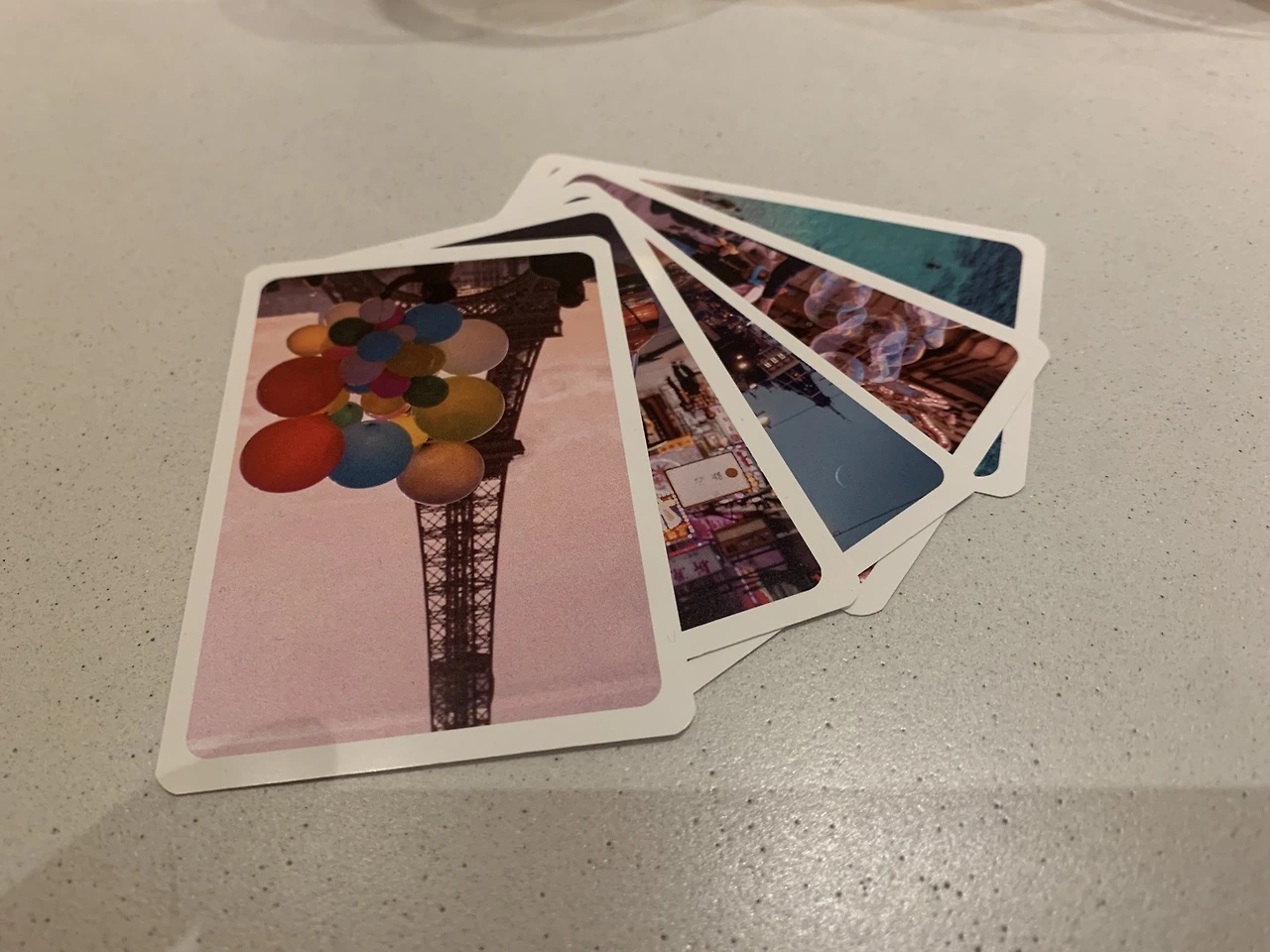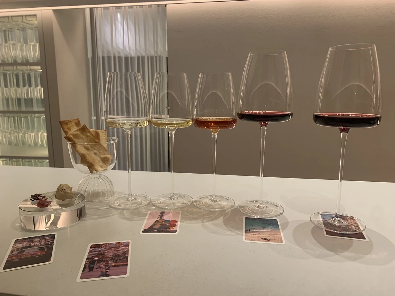 원하는 스타일의 코스를 주문하면 소믈리에 분이 다섯 잔의 와인을 서빙해주십니다. 와인에 대한 특별한 설명 없이 서빙해주시기 때문에 와인의 맛, 색깔, 향 등을 '계급장 떼고' 테이스팅 할 수 있습니다. 사실 비싼 와인이라고 하면 왠지 더 맛있는 것 같고, 싼 와인이라고 하면 왠지 싼 맛이 나는 것 같은 게 사람 심리인데요. 이렇게 블라인드 테이스팅을 통해서 본인의 취향을 찾기도 하고 편견 없이 와인 자체의 매력을 느낄 수 있게 됩니다. 와인소셜에서는 함께 간 사람들끼리 와인에 대해 다양한 대화를 할 수 있도록 재미있는 장치도 함께 제공하는데요. 손님은 여러 가지 이미지가 담긴 5장의 포토카드를 받게 됩니다. 사진의 이미지와 와인에서 느껴지는 이미지를 매칭 하면서 와인의 느낌에 대해서 조금 더 쉽게 설명할 수 있게 됩니다.