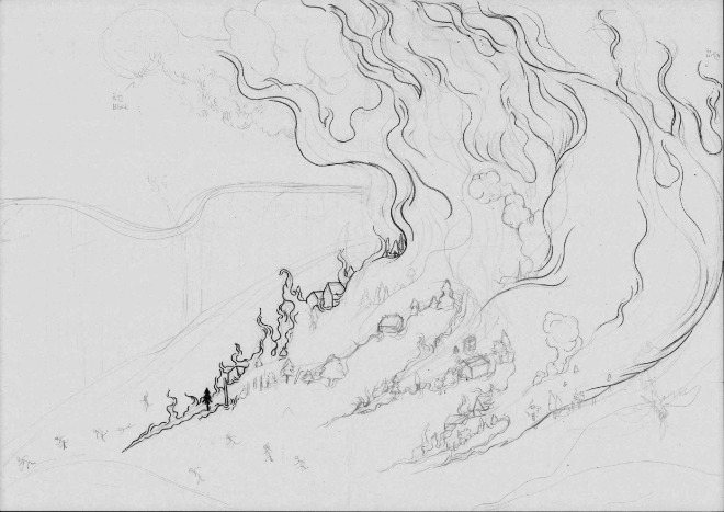 먼저 실제 불의 형상을 최대한 많이 보려고 노력했어요. 활활 타오르는 불을 실제 눈앞에 가져다 놓고 관찰하는 건 어렵기에 사진 이미지나 영상으로 움직이는 불을 봤어요. 그 다음으로는 직관적으로 구도를 잡고 바로 그림 작업에 들어갔던 것 같아요. 이 장면을 완성하기 전에 2번 정도 이미지를 그렸는데 선의 사이가 너무 넓으니 불이 아닌 패턴으로 이루어진 면지 같아 보였어요. 한 장면을 작업하는 데에 많은 시간이 들어서 다시 그리는 게 속상하기도 했지만 원하는 느낌이 나올 때까지 계속 시도했어요.