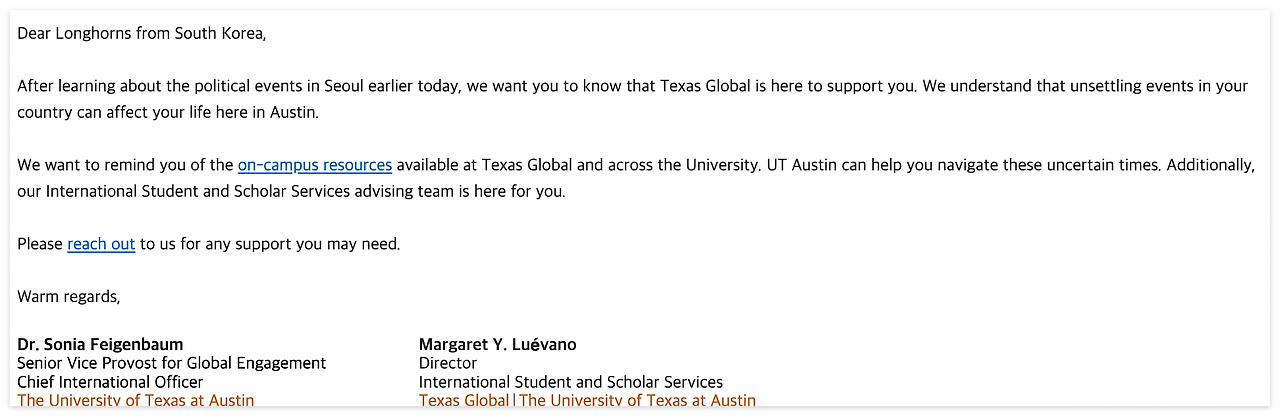 ISS는 외국인 학생을 대상으로 이민과 세금, 재정 지원과 관련된 상담 등을 제공한다. 국제 학생들이 학업과 현지 생활에 성공적으로 적응하도록 돕는 기관인데, 사실 온라인 수강생이 받을 도움은 많지 않다. 아래는 지난 비상 계엄령이 내려졌을 당시 ISSS에서 보낸 사려 깊은 이메일.
