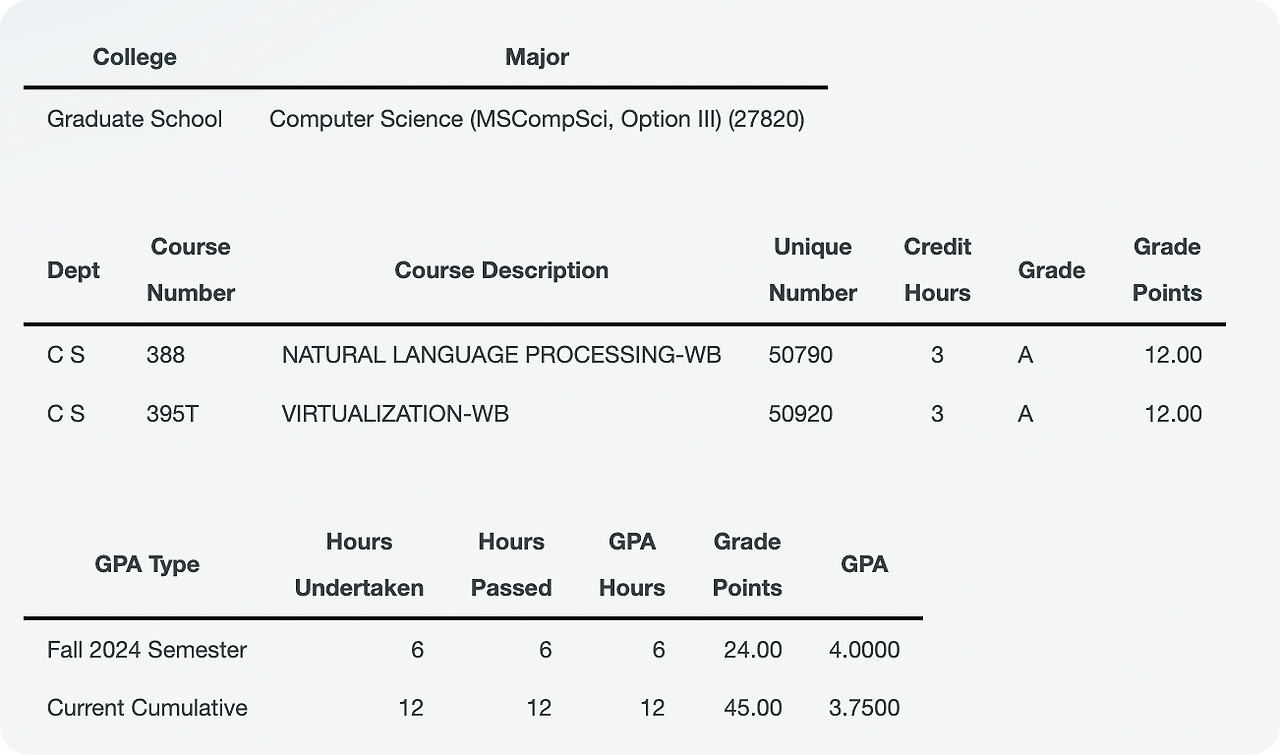 학비는 앞선 글에서 소개한 것처럼 한 과목당 1,000 USD이다. 총 10과목을 들어야 졸업이므로 재수강 등 특별한 경우가 아니라면 졸업까지 학비는 10,000 USD가 필요하다. UT Austin의 경우 매 학기마다 ISS(국제 학생 및 학자 서비스)에서 외국인 학생을 대상으로 125 USD를 추가로 요구한다. 내 경우 가을 학기에 CS388(자연어 처리)과 CS380(가상화) 두 과목을 들었고 등록금으로 2,125달러를 지불했다.