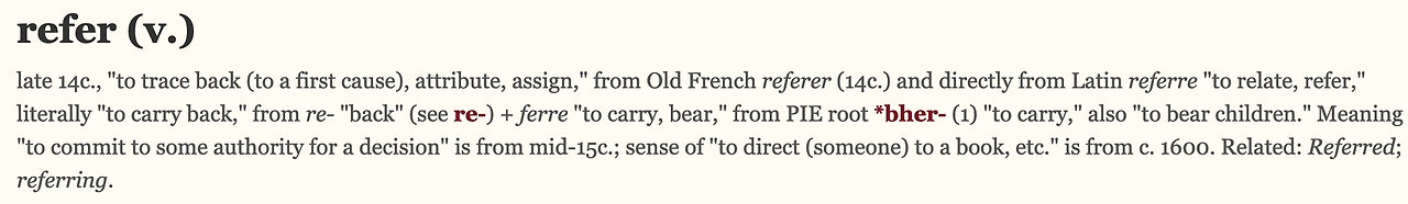 'referre의 의미는 'bring back, bear back'으로 또 다른 단어 'refer'의 어원이기도 하다.