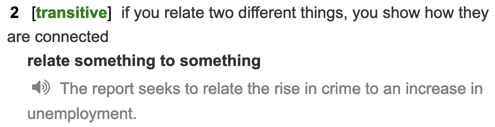 relate에는 처음 어원에서 살펴봤듯이 "뭔가를 다시 지니는 것- 따라서 그 뭔가와 연관이 있거나 관계시키다."의 의미가 나온다.