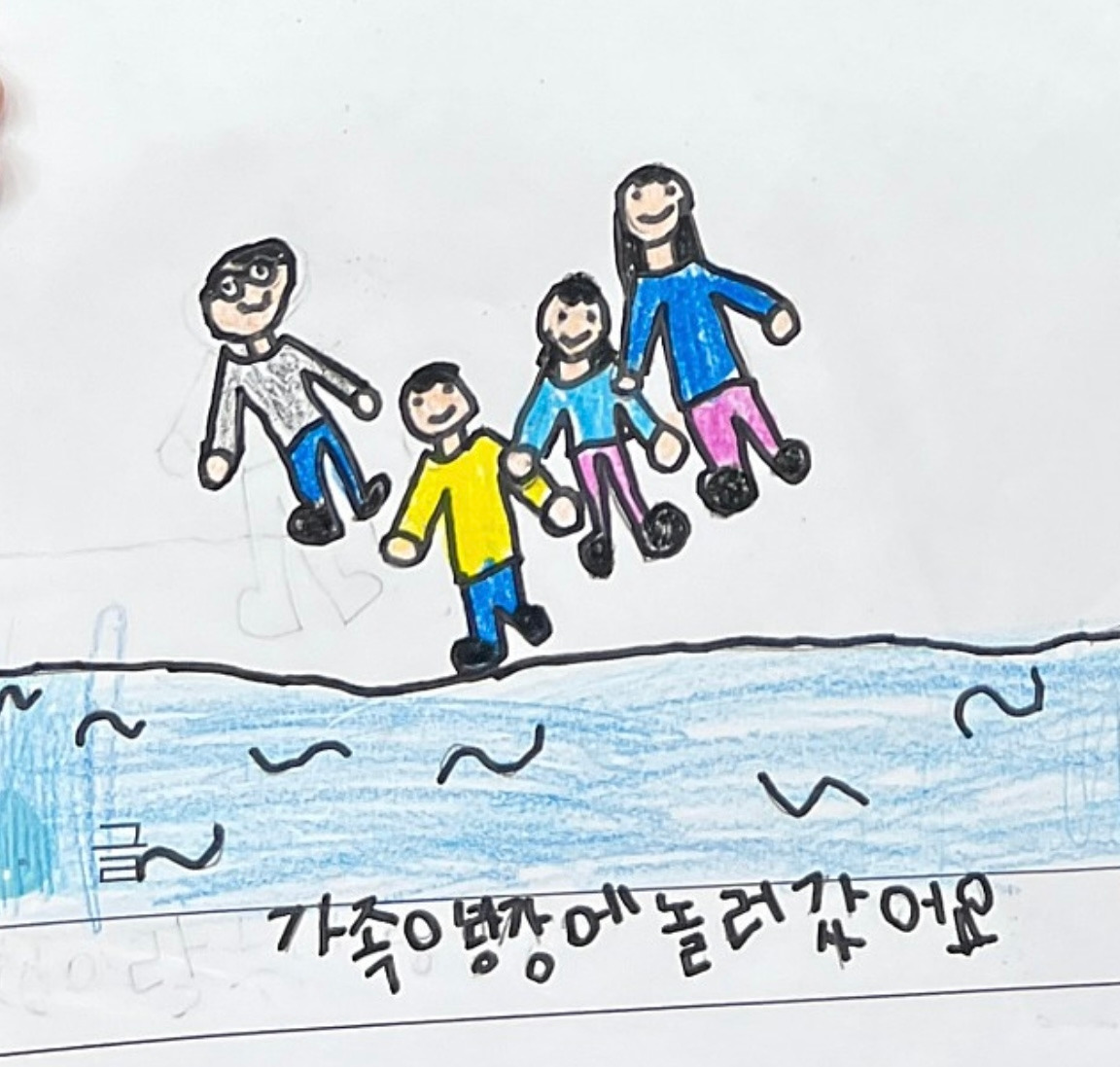 어제는 일하다가 왕자네 어린이집에서 물놀이 관련 주제로 그리기 활동한 사진을 확인했다. 왕자 그림 속 네 식구 모습에, 아이가 그린 아빠 얼굴에 어쩐지 저릿해지는 가슴 한 편이 신경 쓰여서 그땐 아빠 혼자 조금 떨어져 있는 줄도 몰랐다.