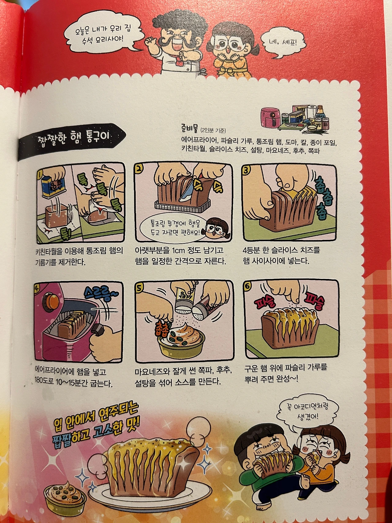 어제 꽂힌 것은 바로 그 13권에 나오는 "햄 통구이". 자기 전에 집에 통조림 햄 있냐고 물을 때 알아봤어야 했는데 오늘 아침 캐리비안베이로 떠나는 공주를 태권도장에 데려다 주고 오니 자고 일어난 왕자가 스팸(그것도 제일 큰 거 한 통)을 귀신같이 찾아서 식탁 위에 레시피북과 함께 셋팅을 해 놓았다.