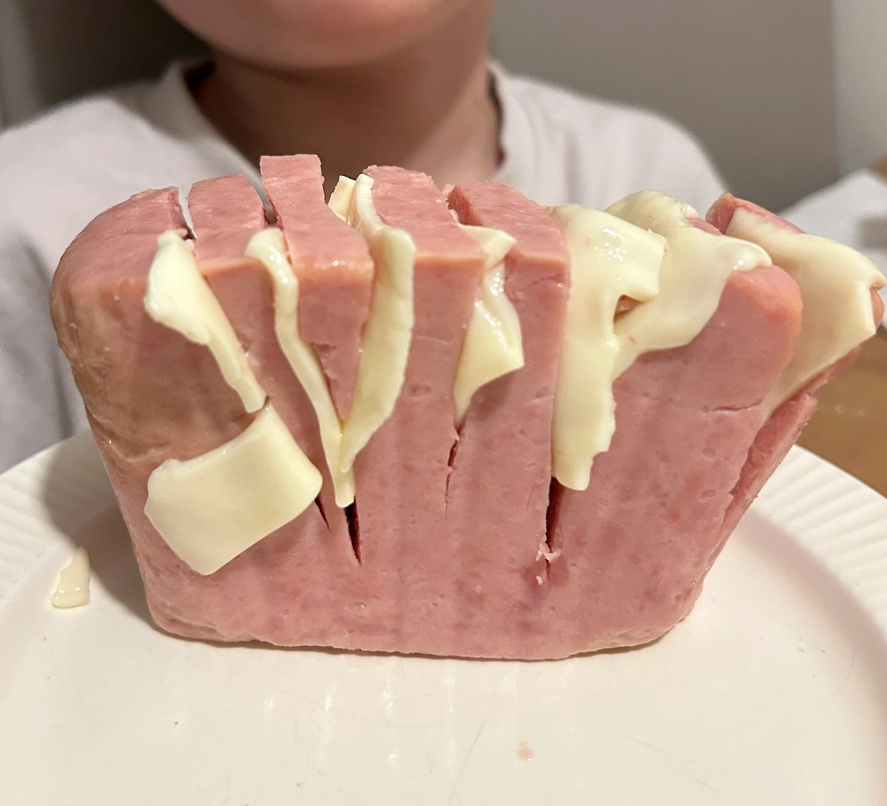 통스팸에 칼집을 내고 사이 사이 슬라이스 치즈를 끼운 후 에어프라이어 180도에서 10분 굽기. 모자라면
