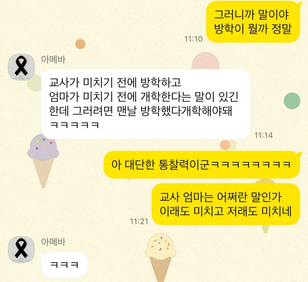 우리 애들 또래 남매를 둔 교사 절친에게서 안부 카톡이 왔는데 프로필 사진이 검은 리본이었다. 생각난 김에 교사 친구들 프사를 보니 하나같이 검은 리본. 리본 색깔처럼 마음이 먹먹해졌다.