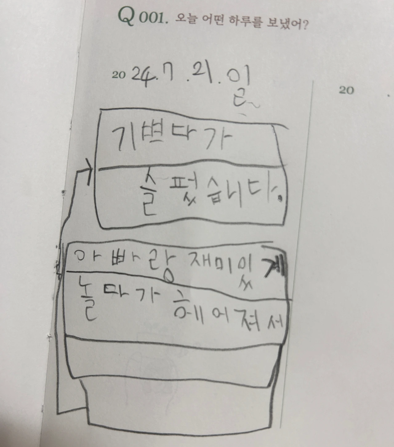어찌어찌 밥을 다 먹이고 일용할 공부와 양치까지 시켜서 일과를 마무리하는데 책상 위에 펼쳐진 일기가 눈에 들어왔다.